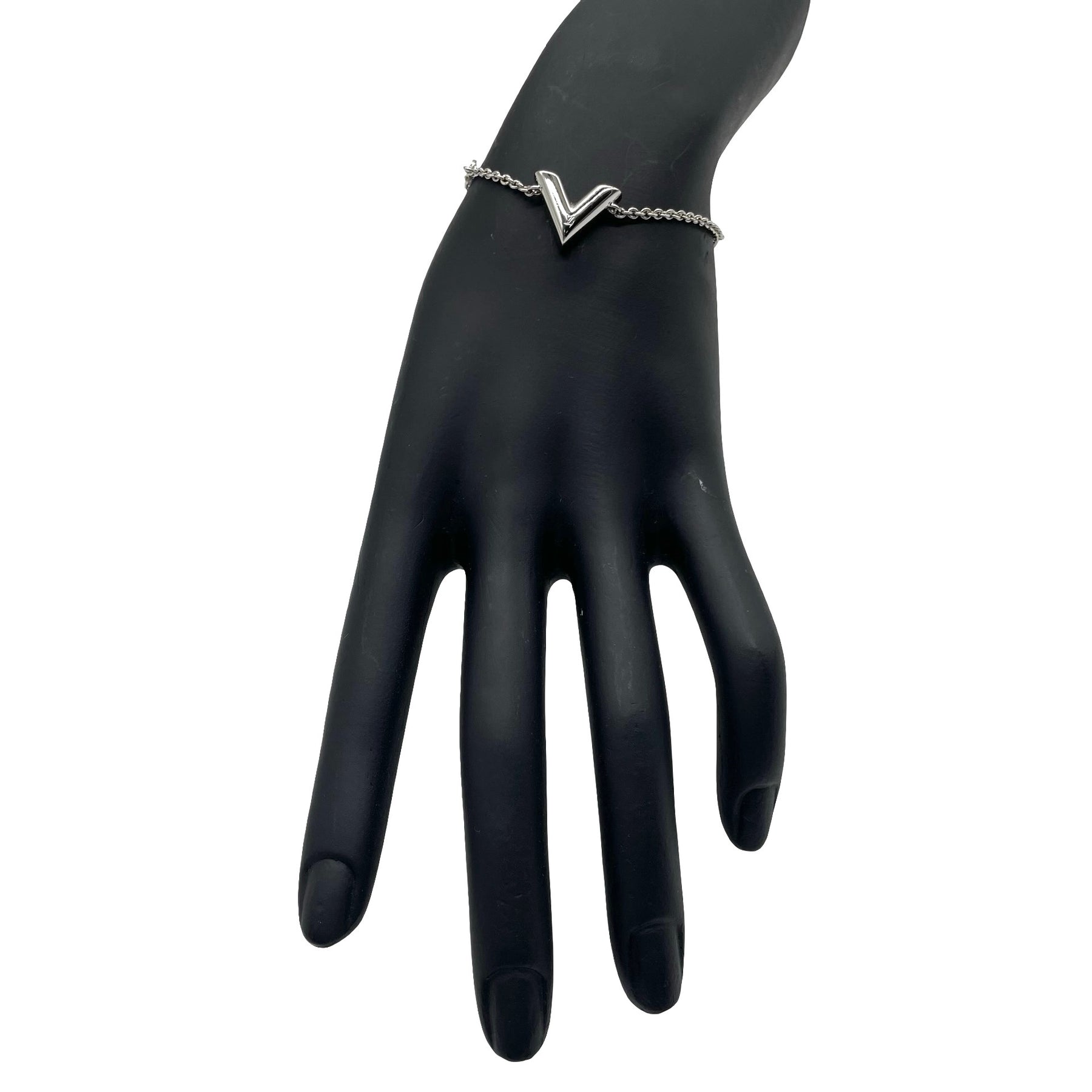 Pulsera Louis Vuitton Essential V, de metal con acabado en color plateado. Con sello LV grabado frente a la V. Con ligero desgaste en la parte trasera. Con uso, en buen estado.