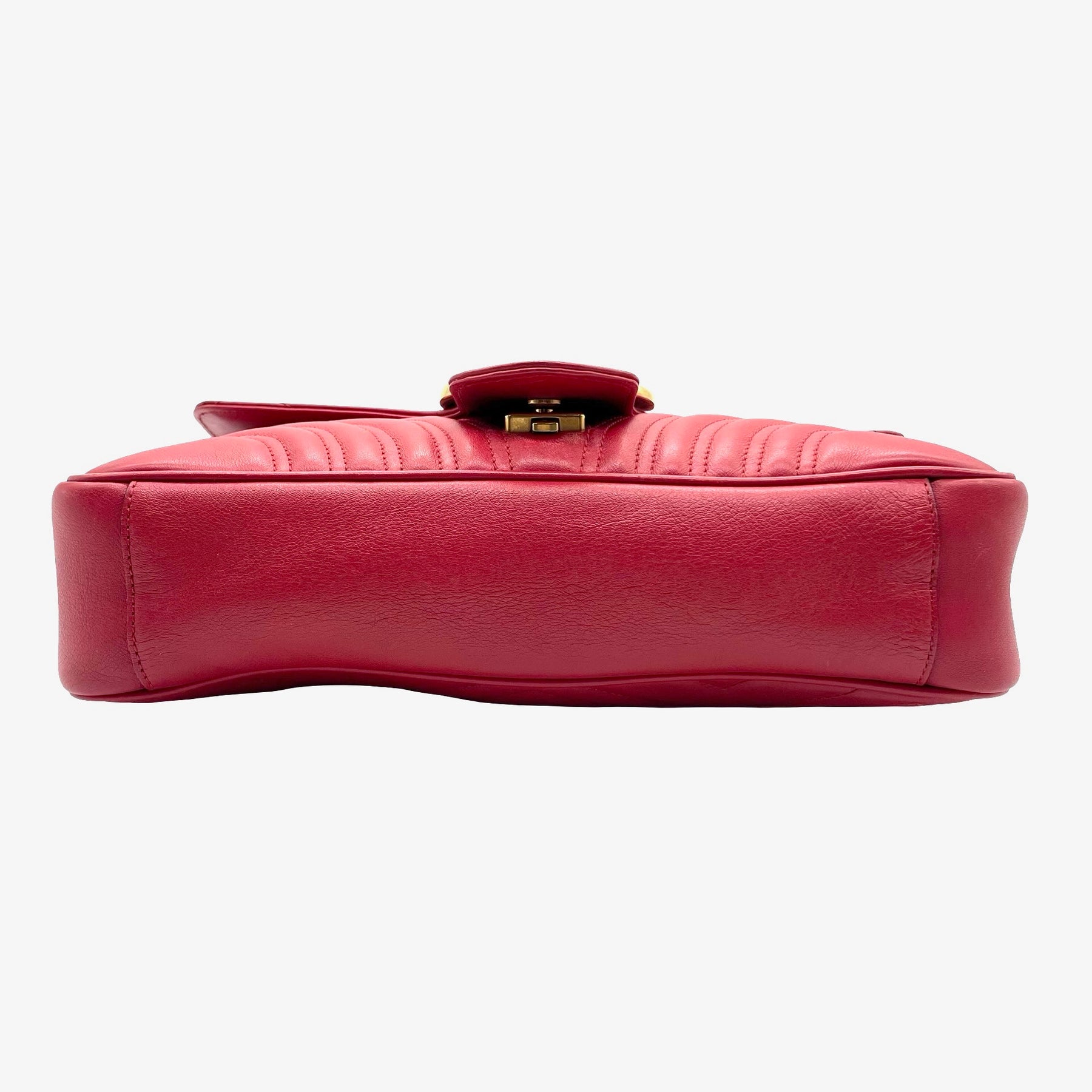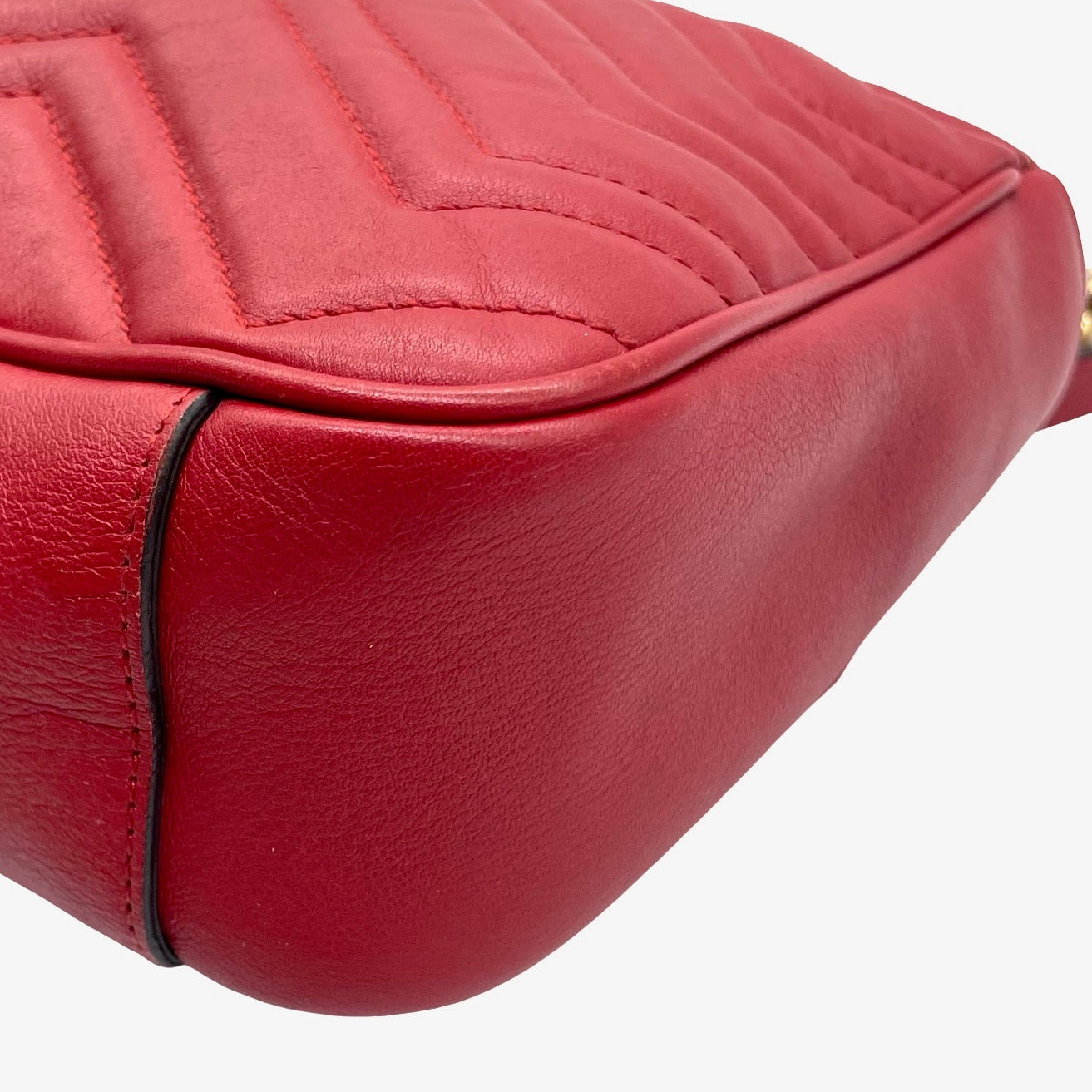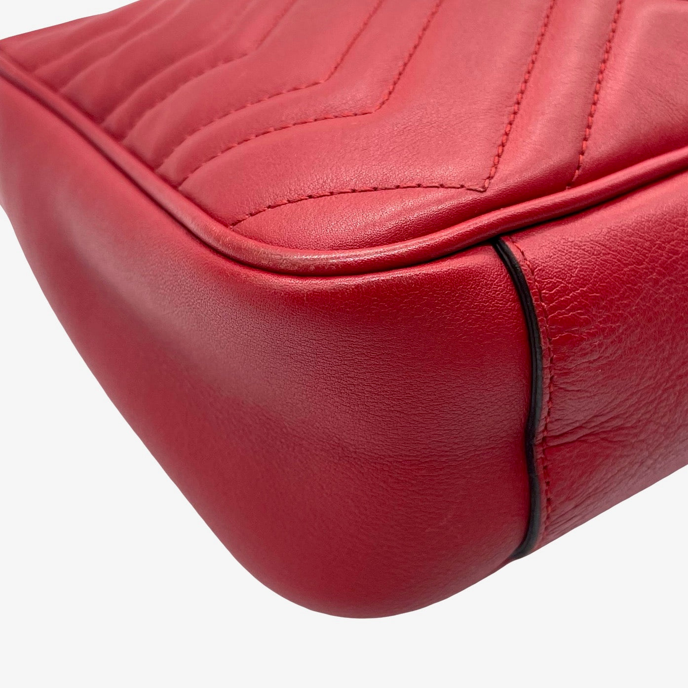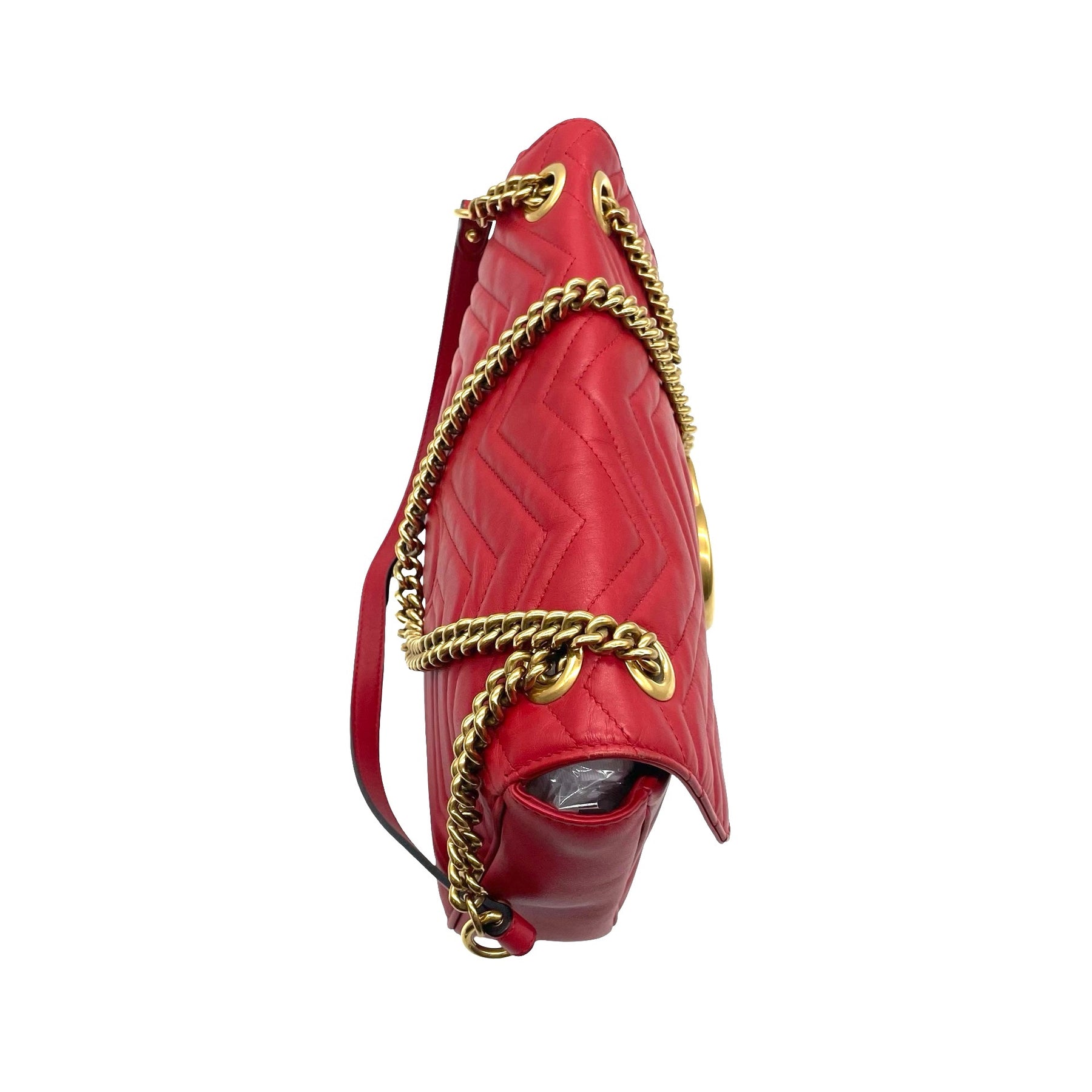 Bolsa Gucci GG Marmont, de piel color rojo, con herrajes en dorado, hebilla GG enfrente y cadena al hombro. Con ligero desgaste en orillas. Con uso, en buen estado.