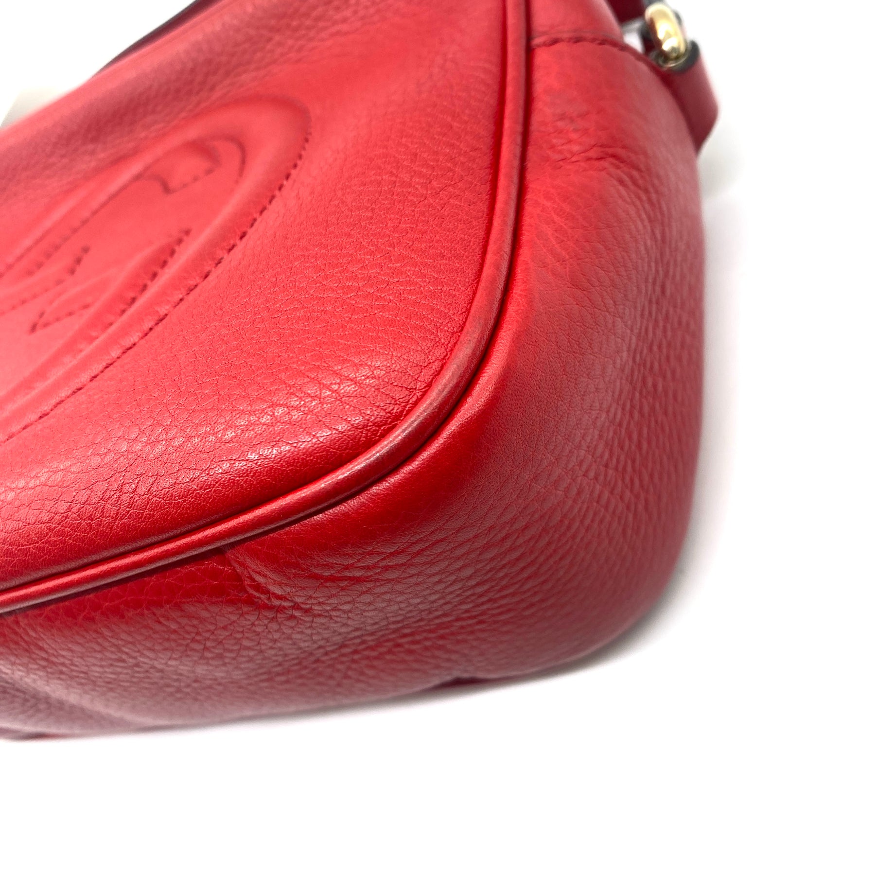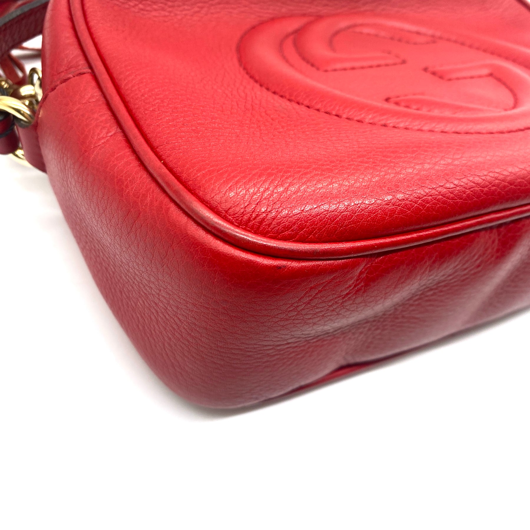 Bolsa Gucci Soho Disco, en piel granulada color rojo con GG grabado enfrente y con correa al hombro. Con ligero desgaste en piel, pequeñas manchas en color blanco en la parte superior y en interior. Con ligero desgaste de uso.