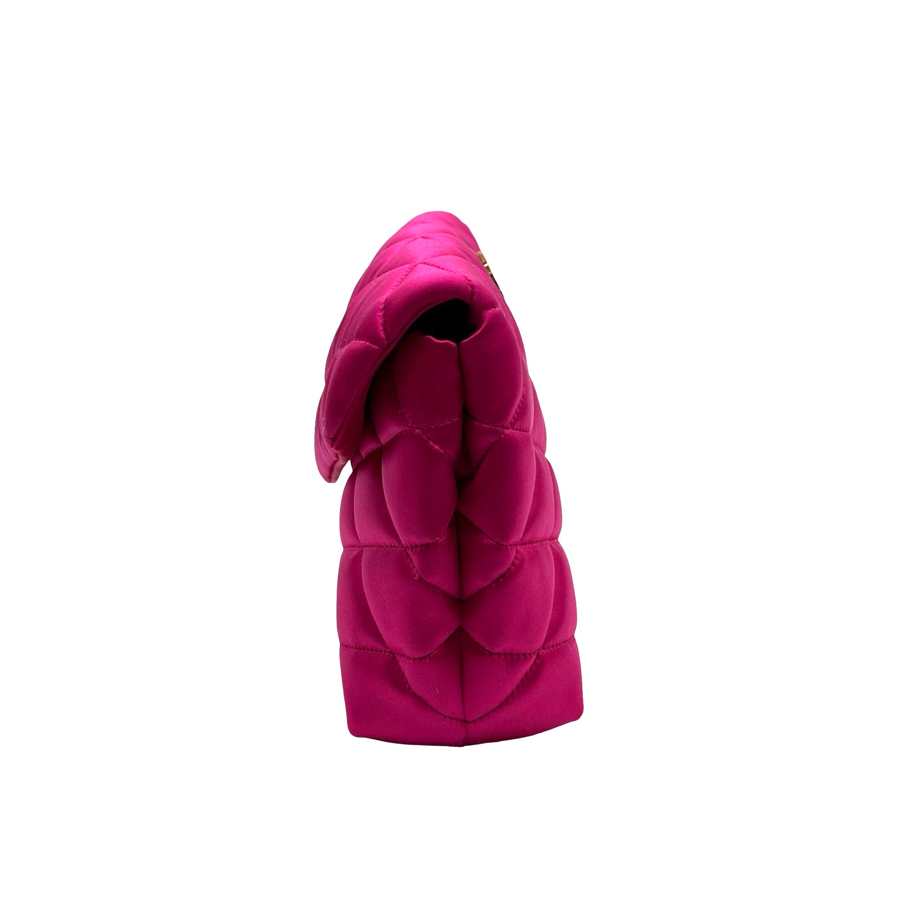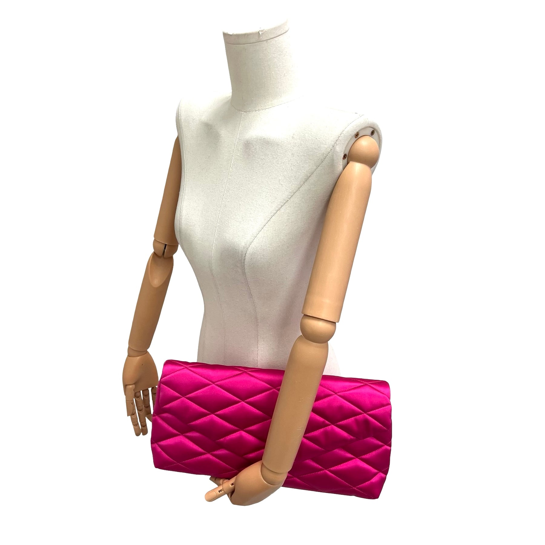 Clutch Saint Laurent, de satín acolchado color fucsia y logo de piel y metal dorado en la parte trasera. Con uso, en excelente estado.