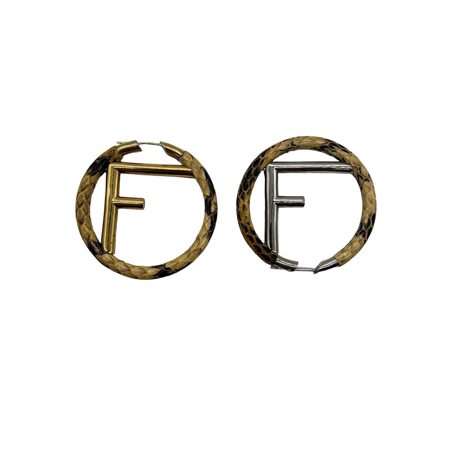 Aretes Fendi F is Fendi, estilo arracadas, en piel Python y metal color dorado y plateado con "F" en el centro. Con uso, en buen estado.
