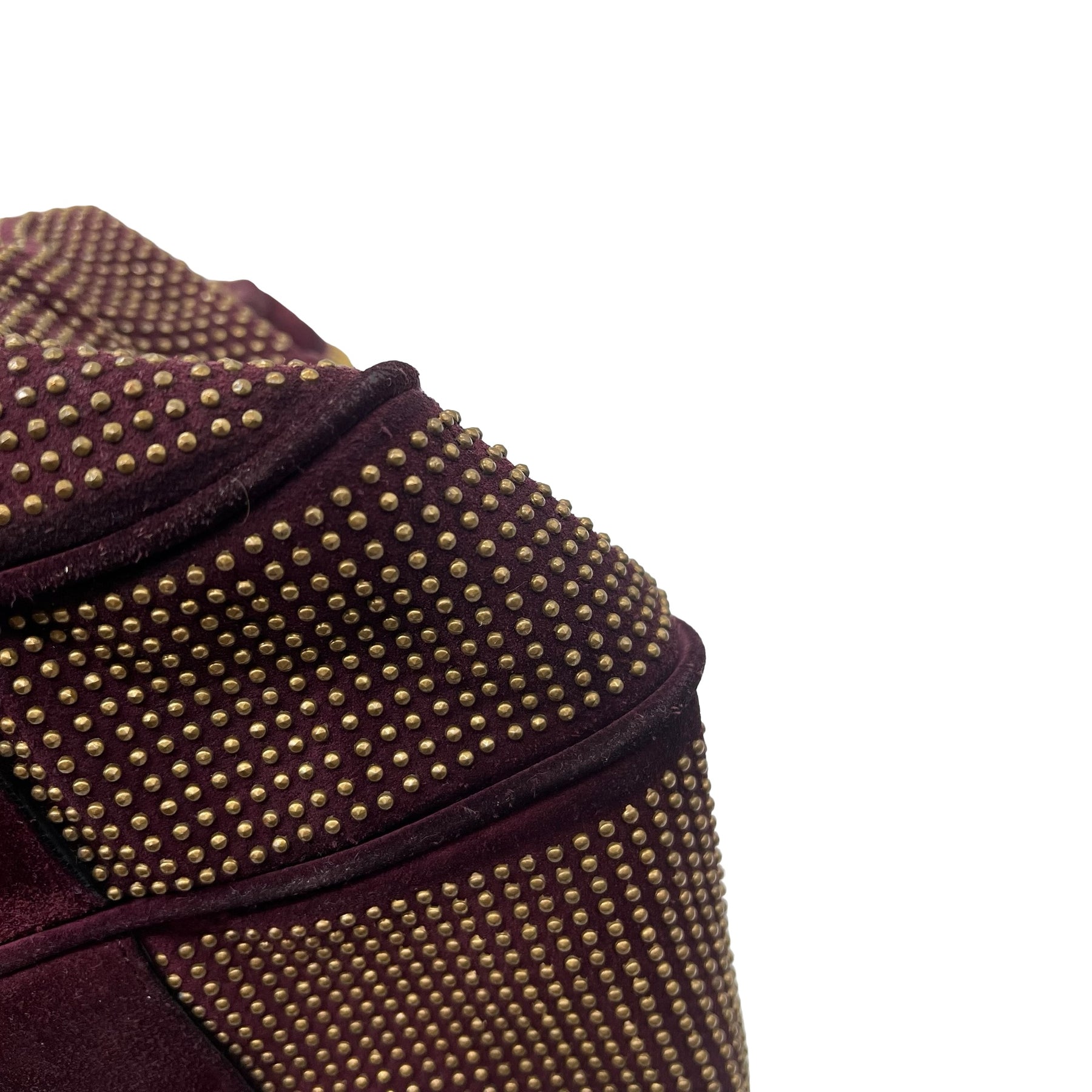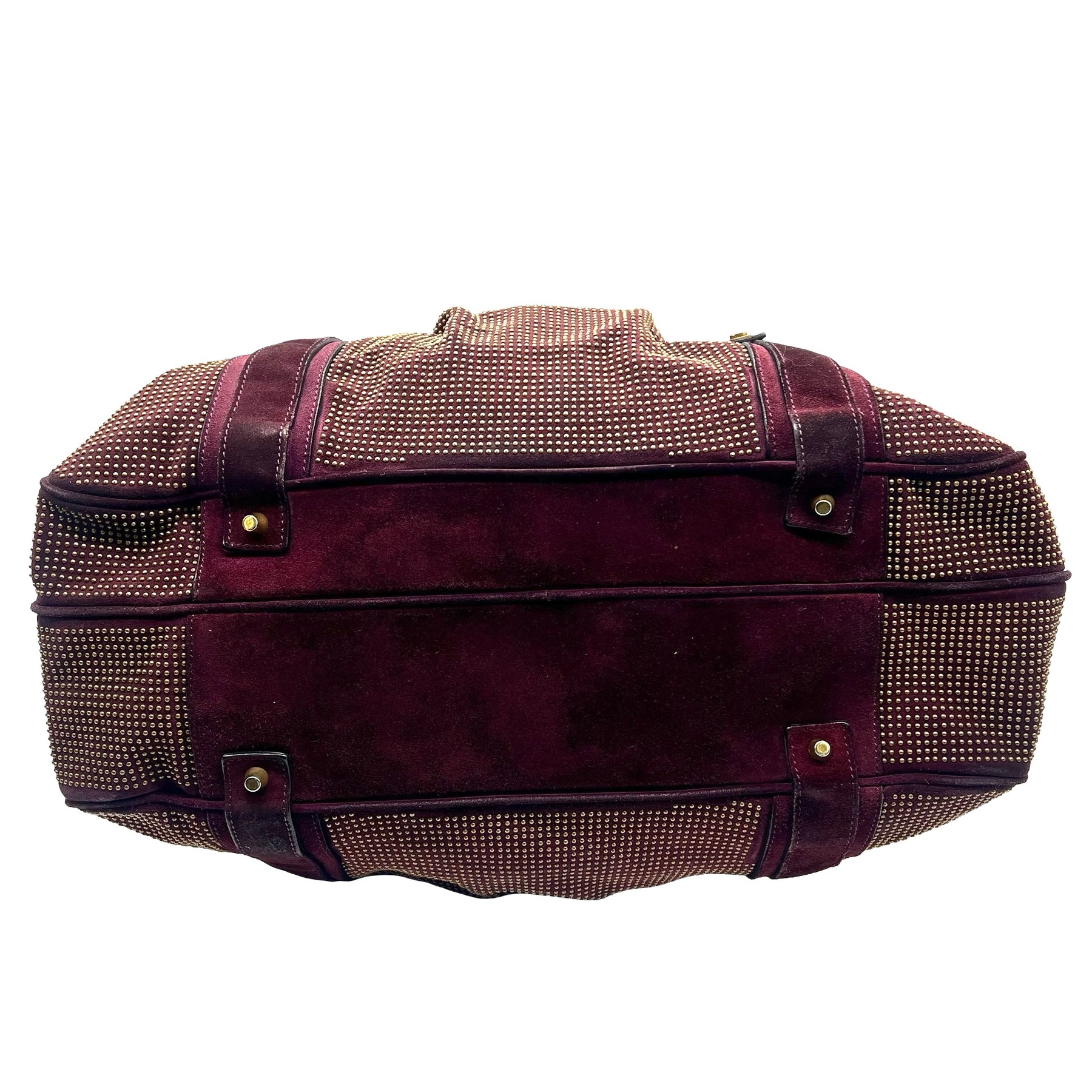 Bolsa Burberry Prorsum, de ante color morado con studs dorados, doble compartimento y dos asas de mano. Con desgaste de uso en piel y esquinas.