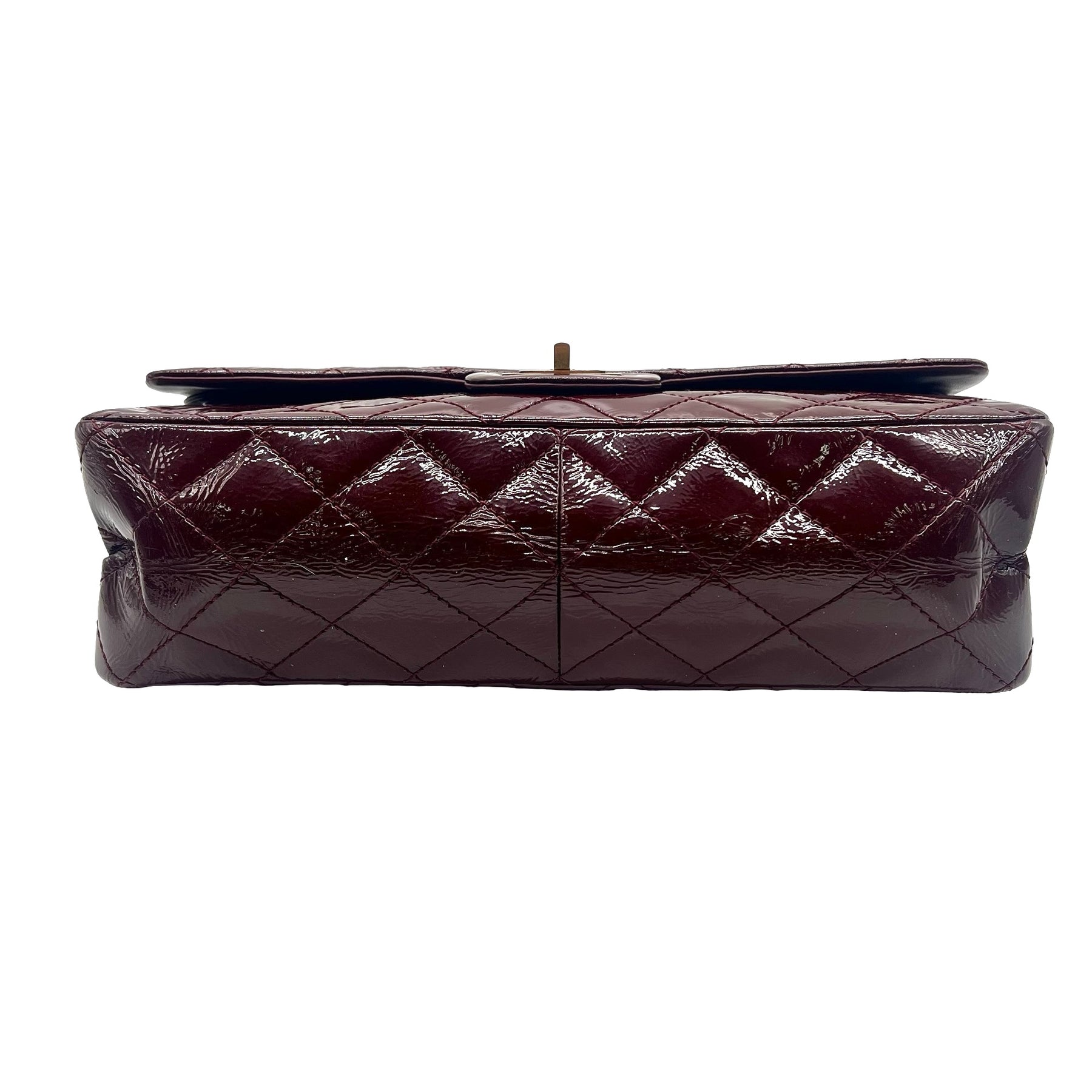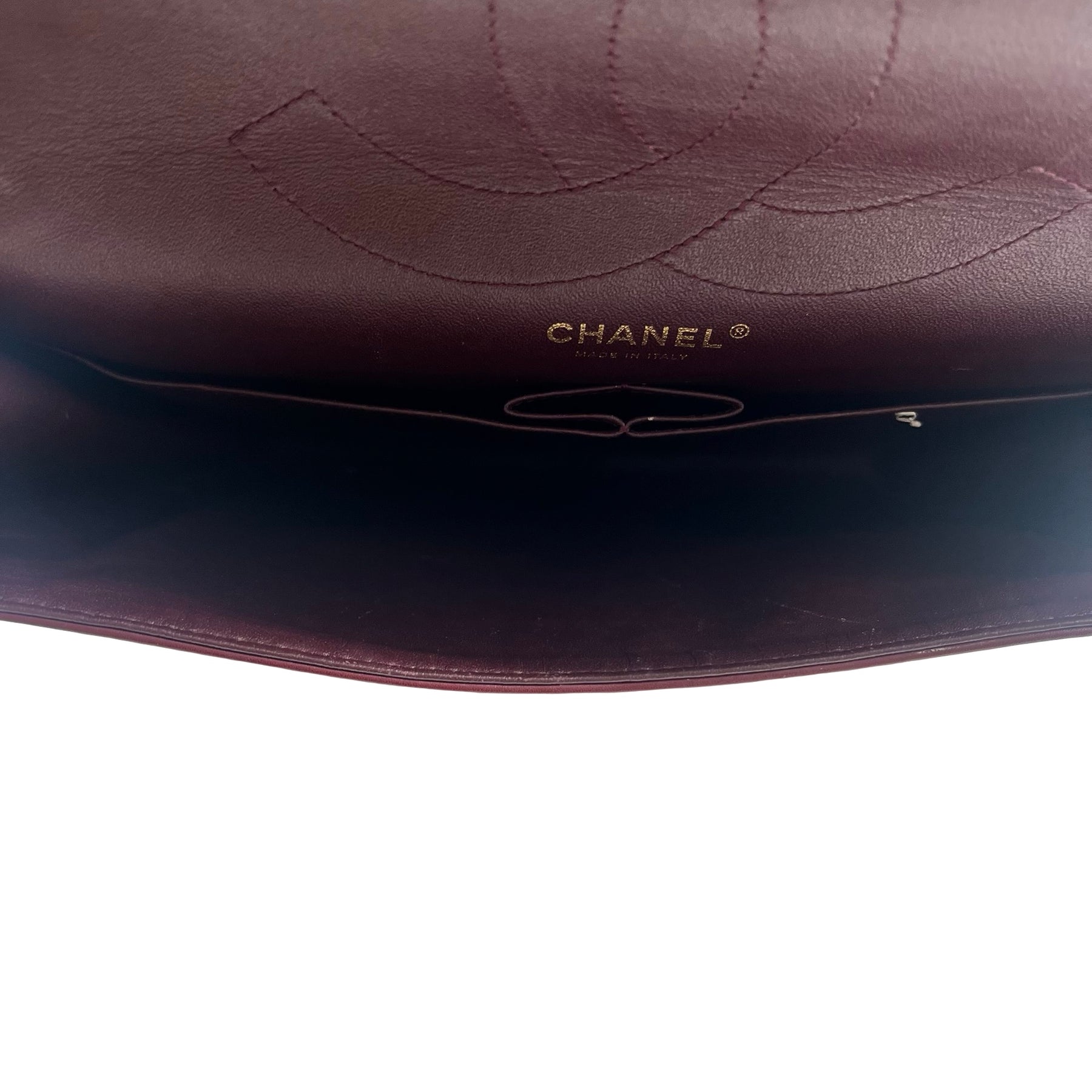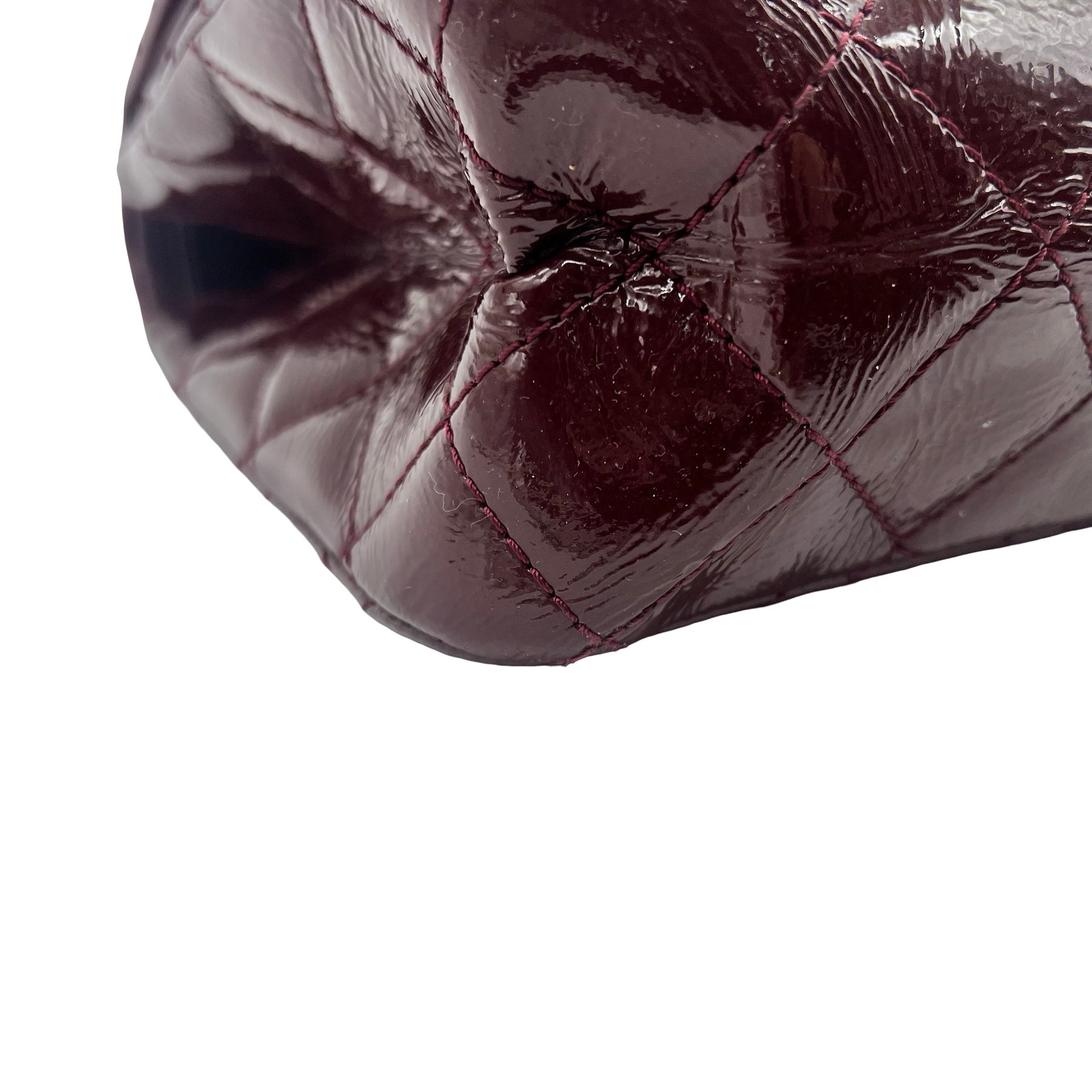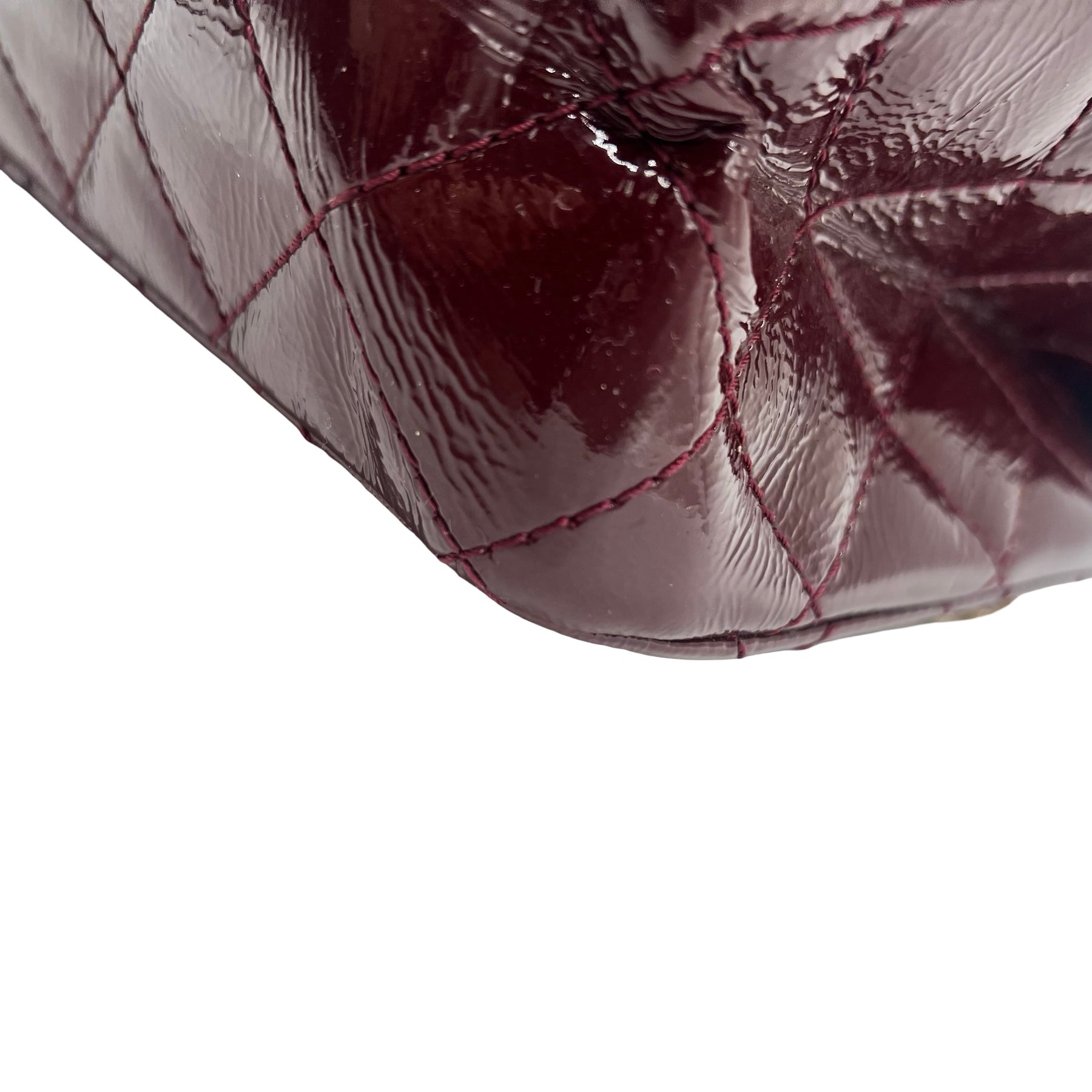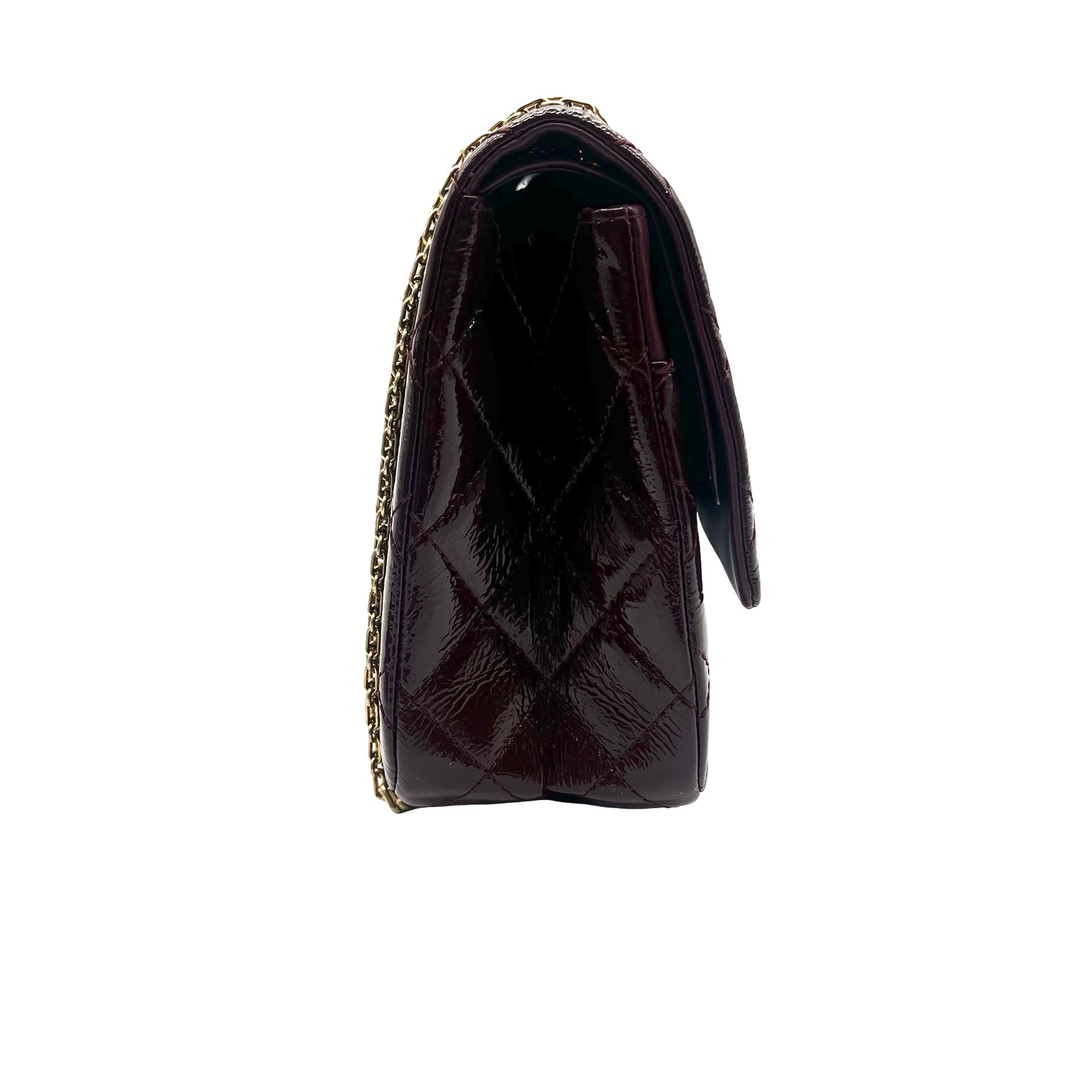 Bolsa Chanel 2.55, tamaño grande, en piel con terminado charol color burgundy, herrajes en dorado y doble cadena al hombro. Con uso y falta de estructura, en buen estado.