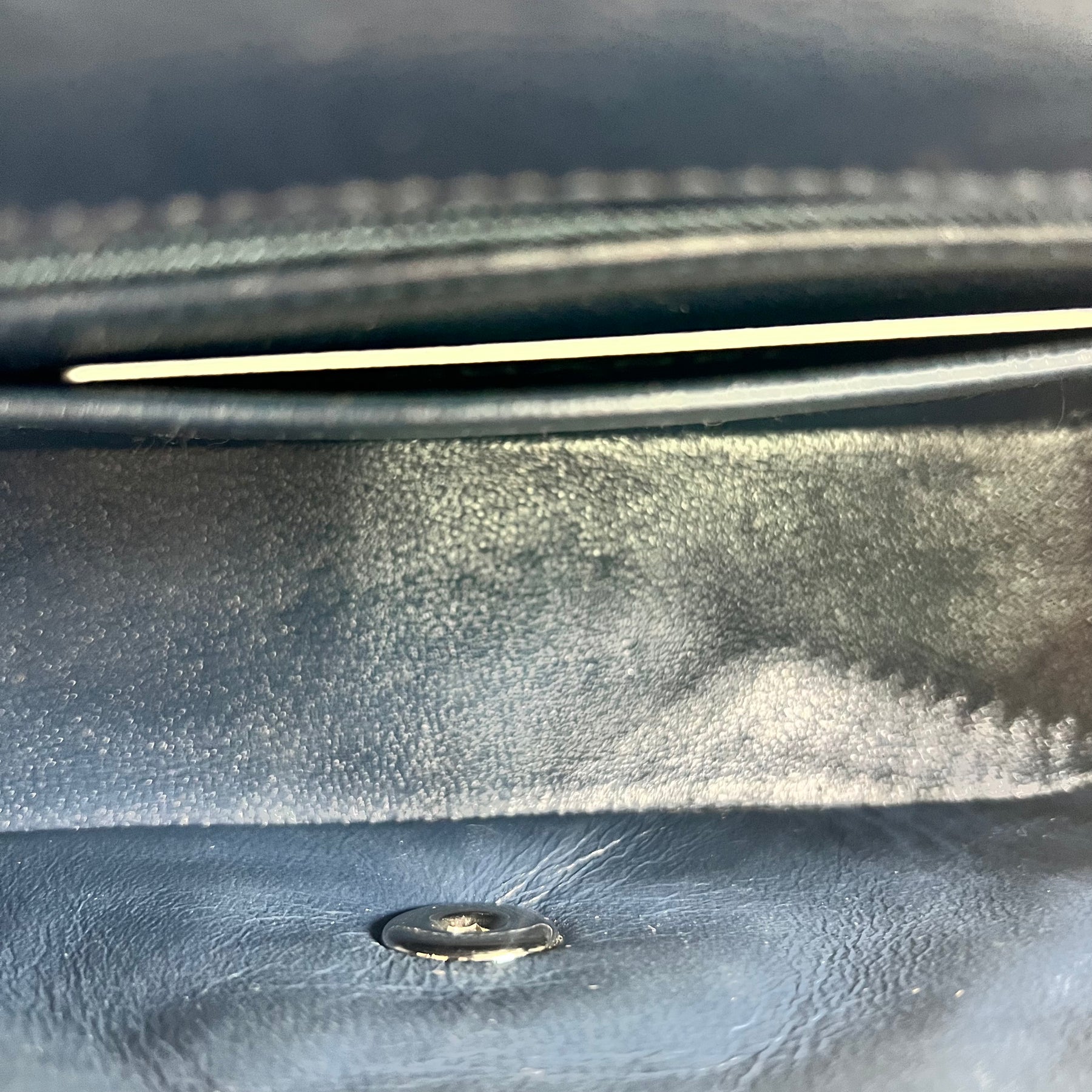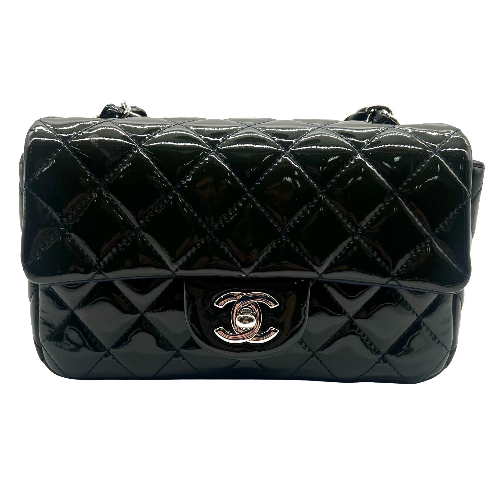 Bolsa Chanel Mini Rectangular flap, en piel terminado charol color verde oscuro, herrajes en plateado y cadena al hombro. En excelente estado.
