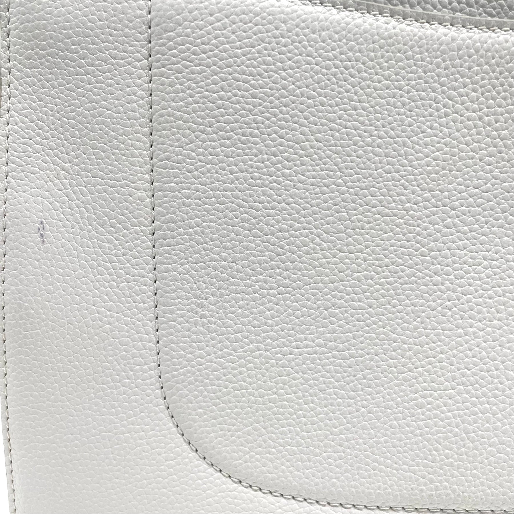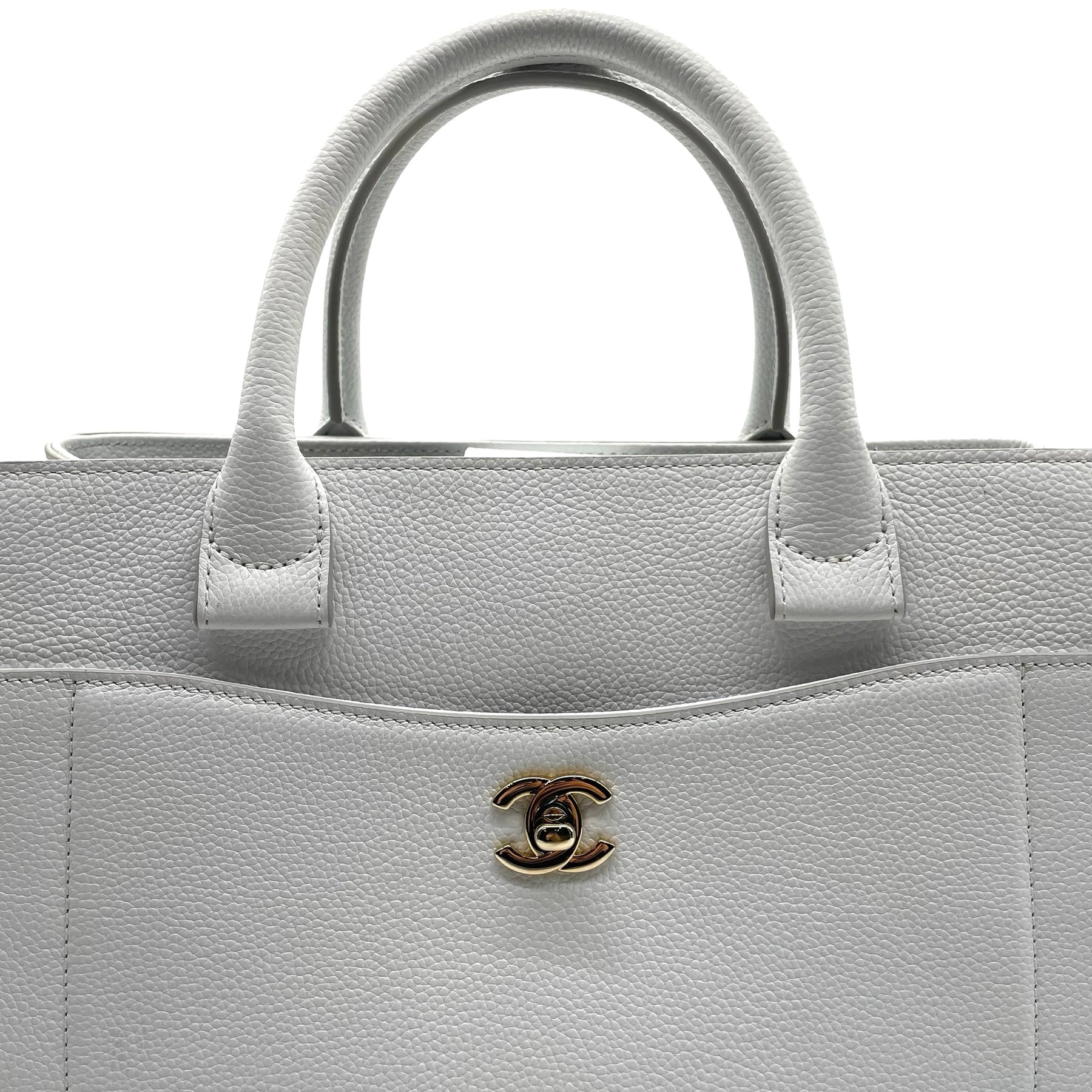 Bolsa Chanel Neo Executive Tote, color blanco, strap largo ajustable y removible, dos asas de mano, en piel con terminado Caviar y herrajes en dorado. Con ligeras manchas en la piel, en buen estado.