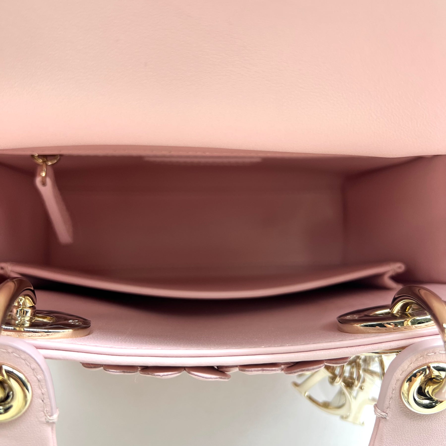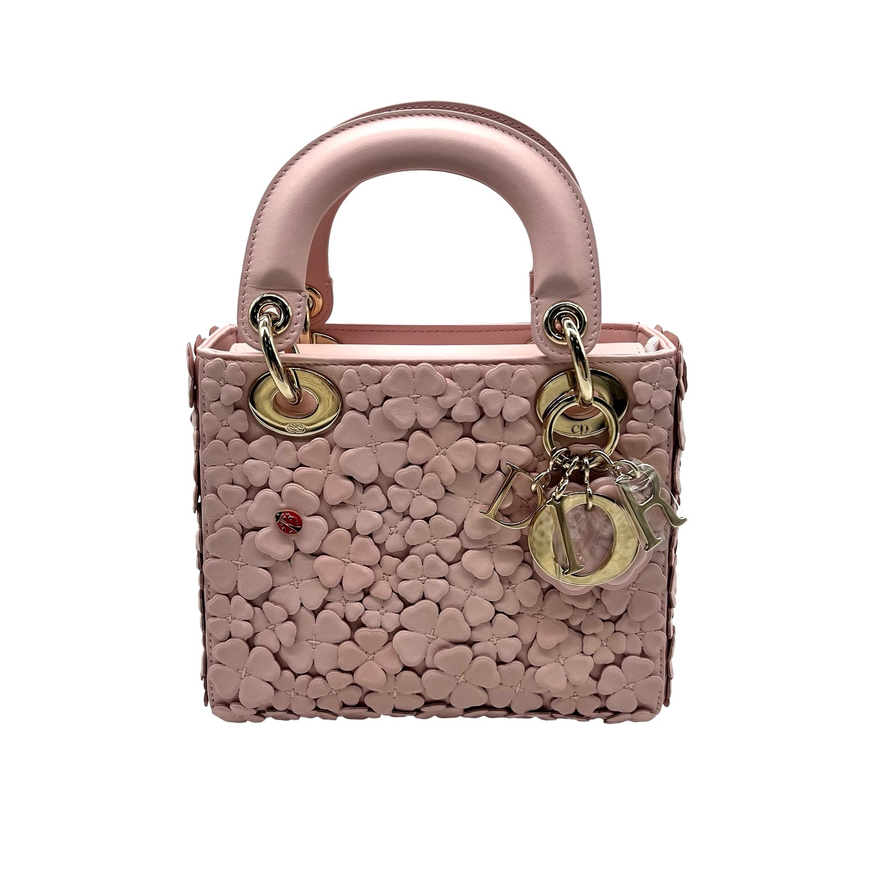 Bolsa Lady Dior, tamaño mini, de la colección Spring Summer 2026 en colaboración con Jonathan Anderson, en piel color Rose Soupir con bordado en motivo "Dior Clover Allover", herrajes en dorado, mariquita decorativa al frente, dos asas de mano y strap al hombro removible. Nueva.