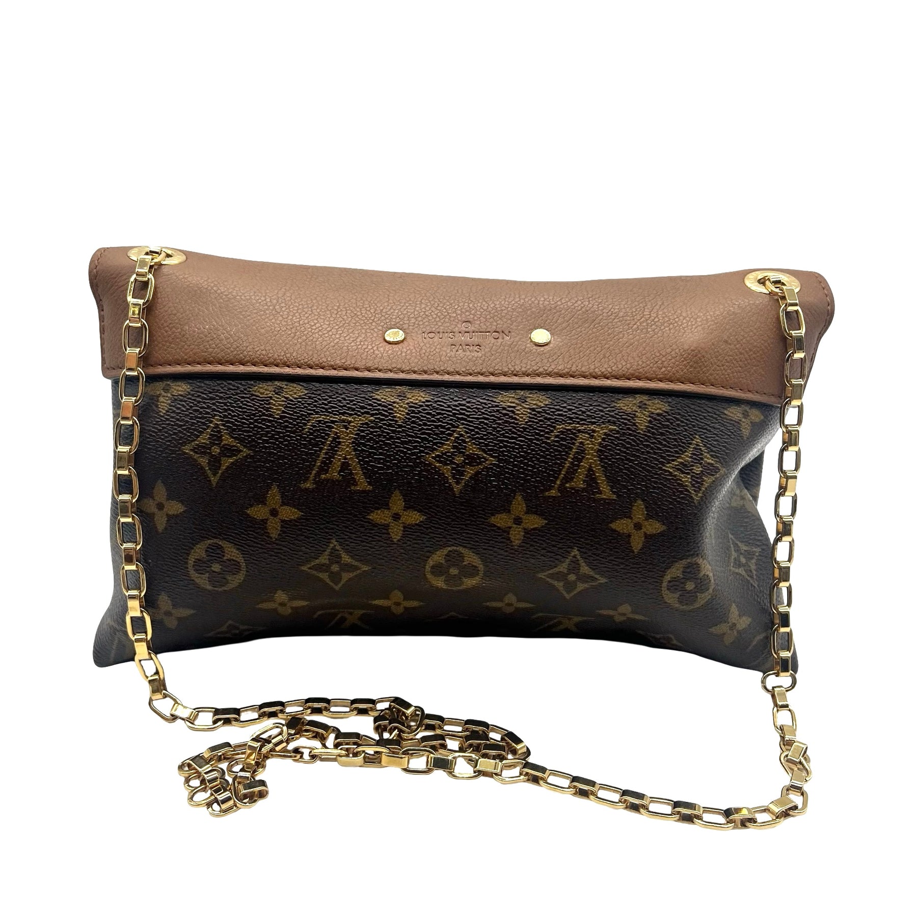Bolsa Louis Vuitton Pallas Chain, en canvas monogram y solapa en piel color café claro, herrajes en dorado y doble cadena al hombro. Con uso y desprendimiento de piel en parte frontal.
