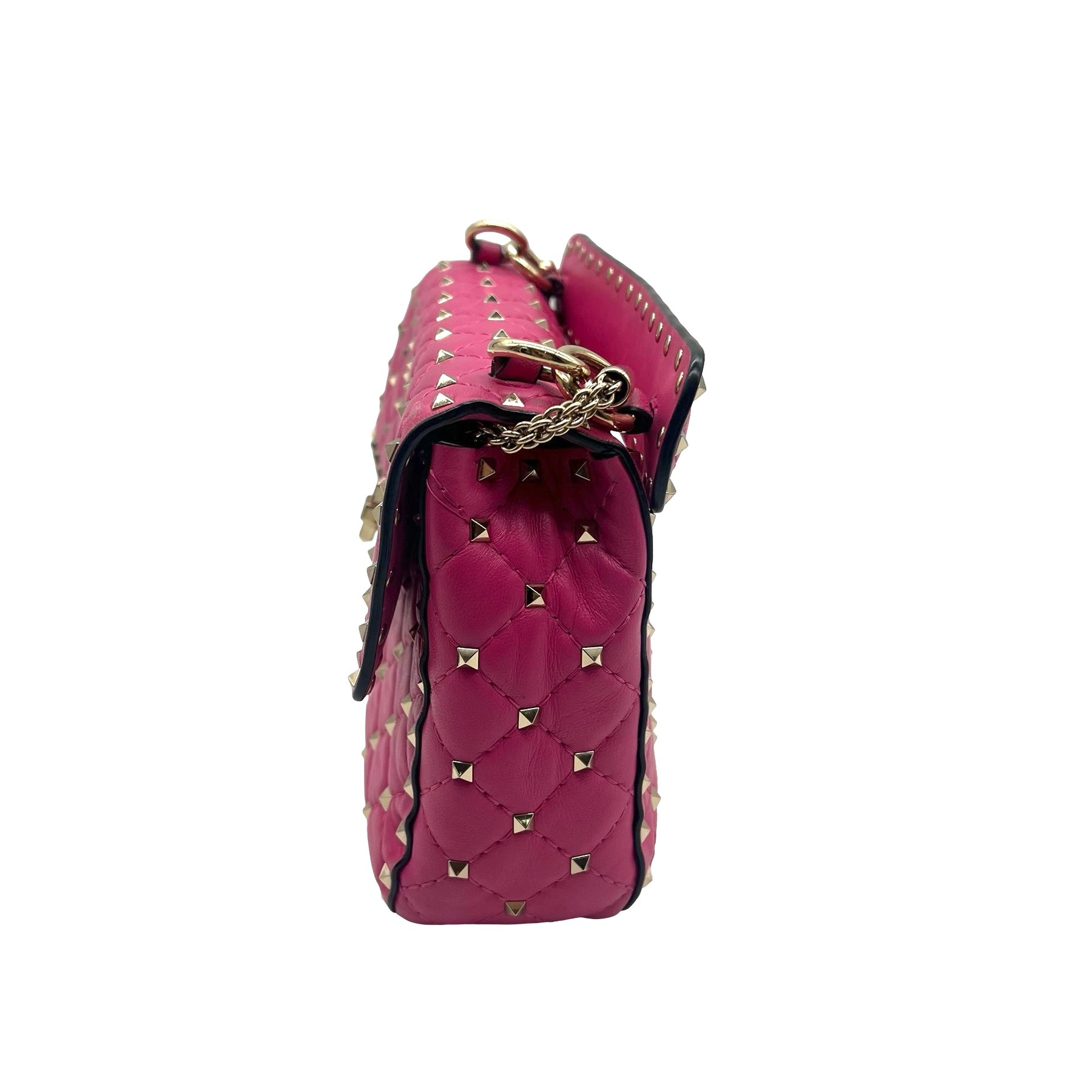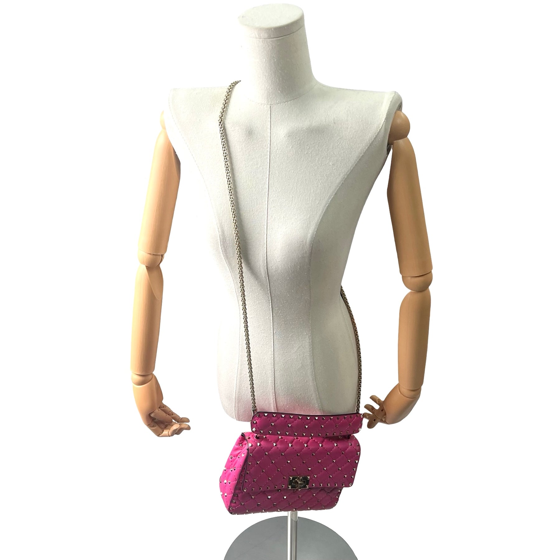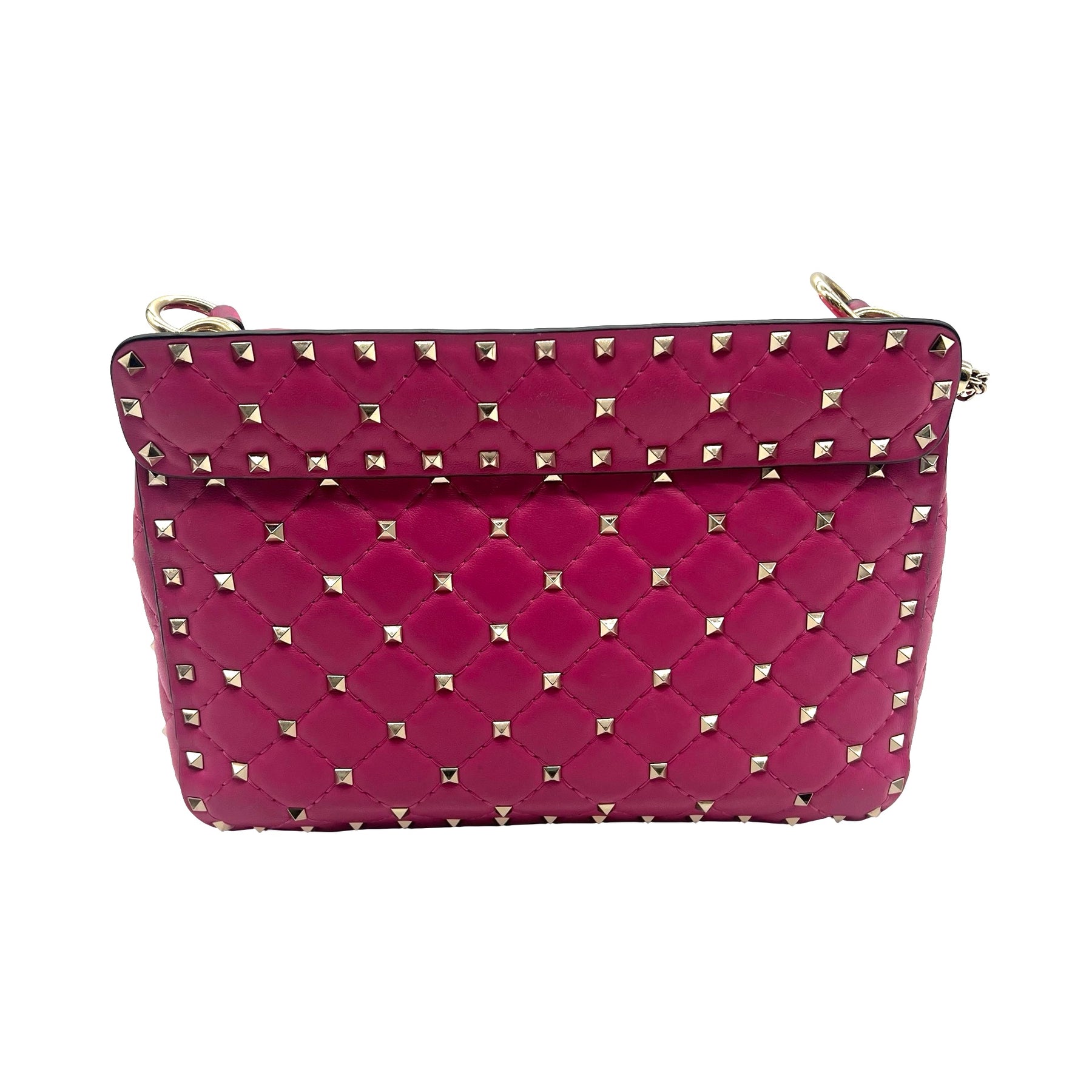 Bolsa Valentino de piel color rosa con studs dorados, asa de mano y cadena larga al hombro. Con uso y manchas en el interior.