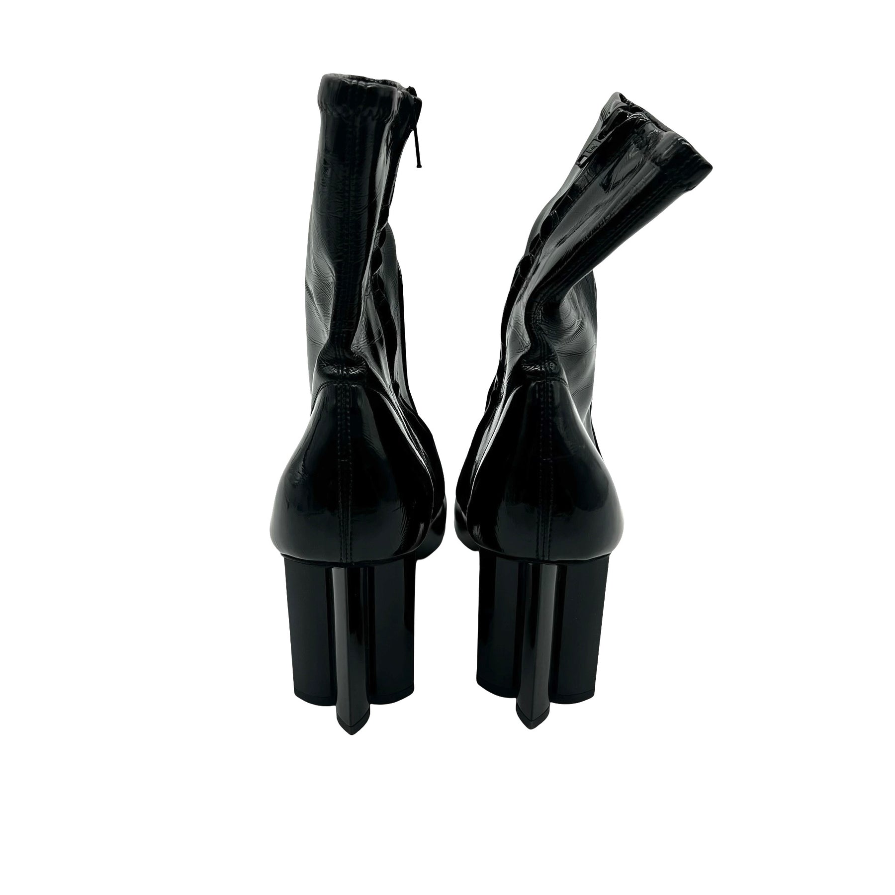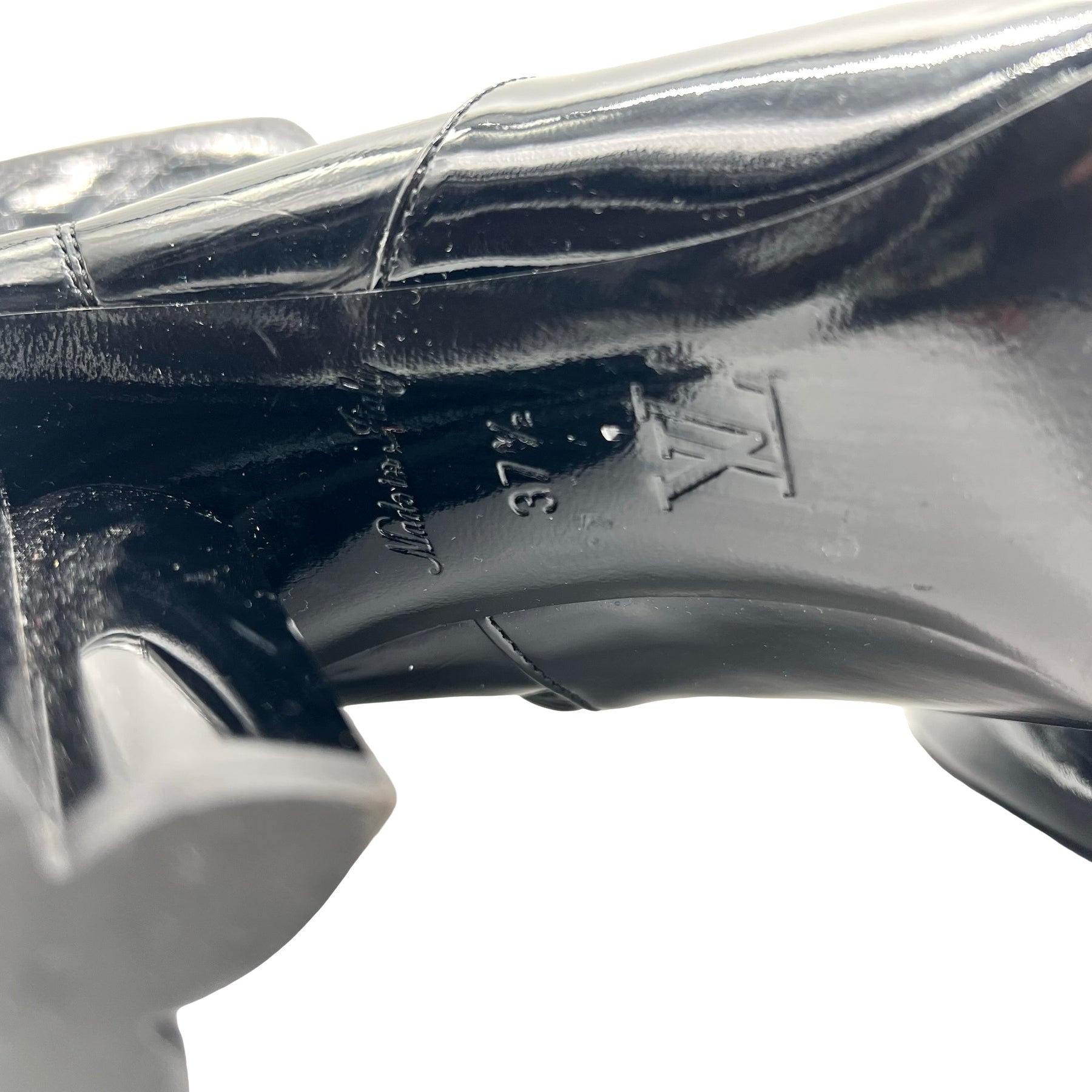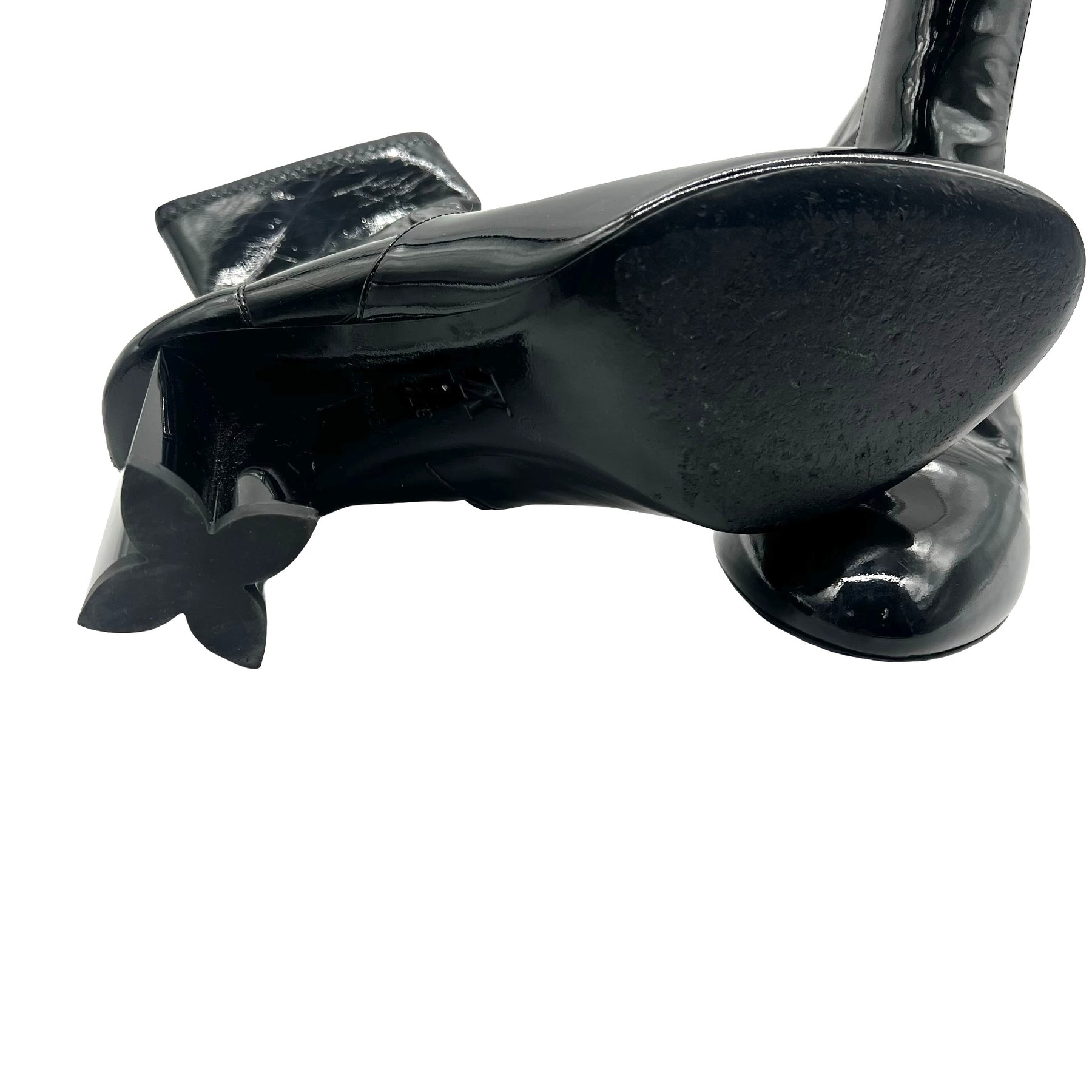 Botines Louis Vuitton Silhouette, en piel y charol color negro con tacón en forma de flor. Con desgaste de uso, en buen estado.