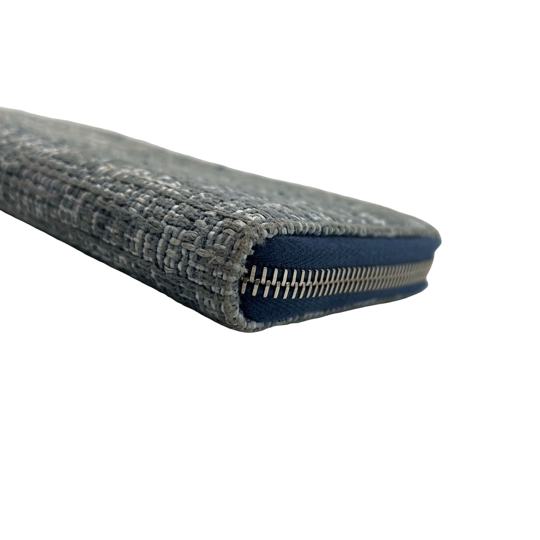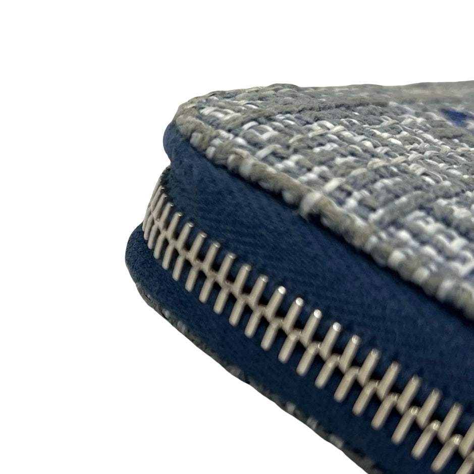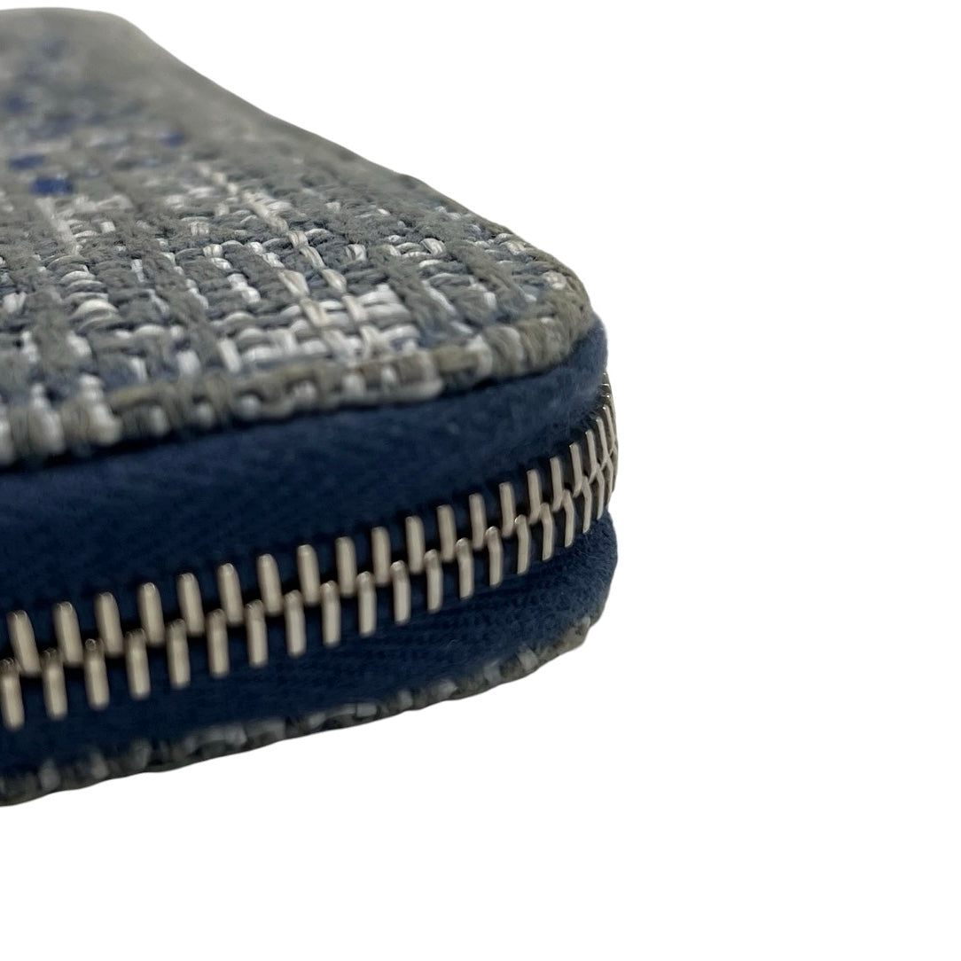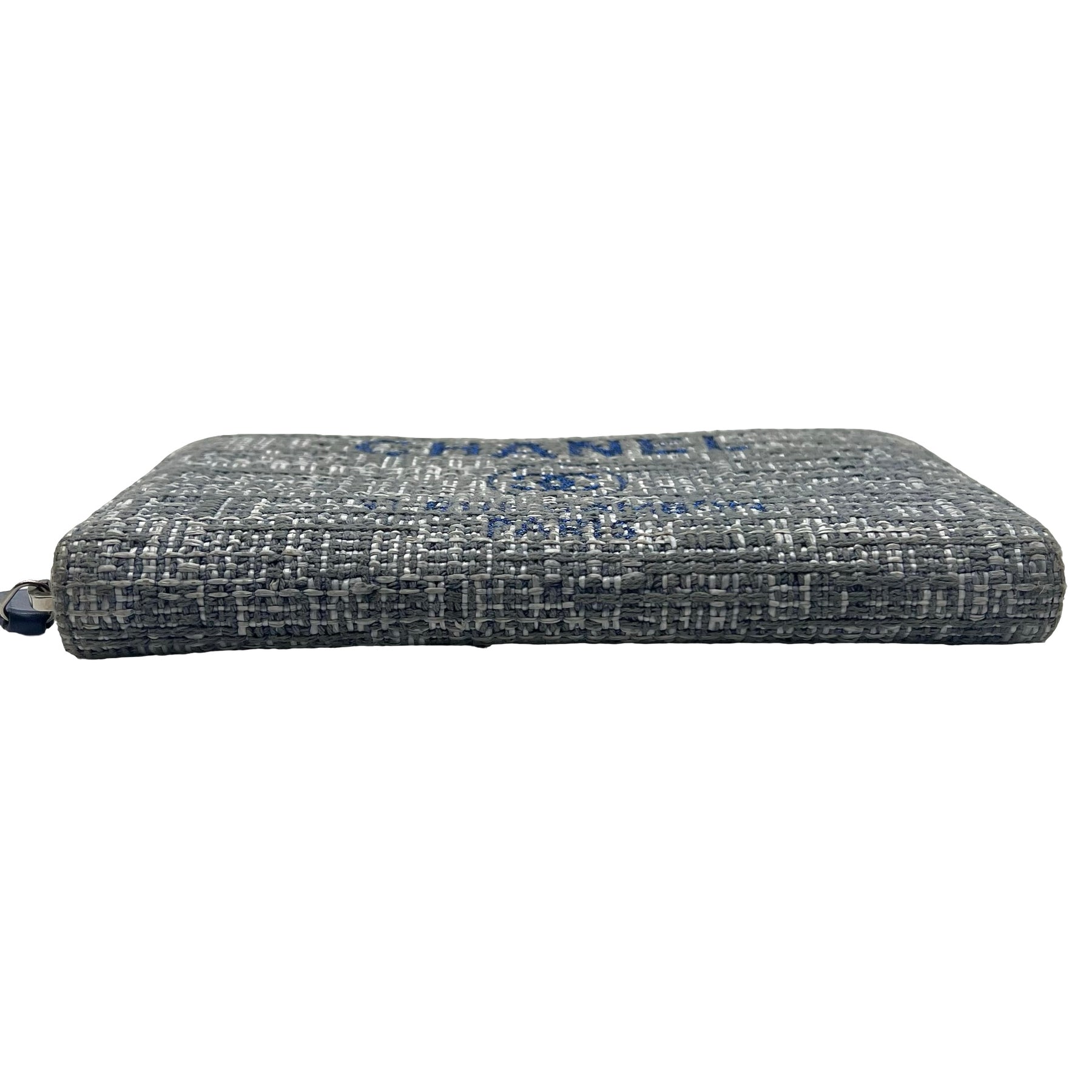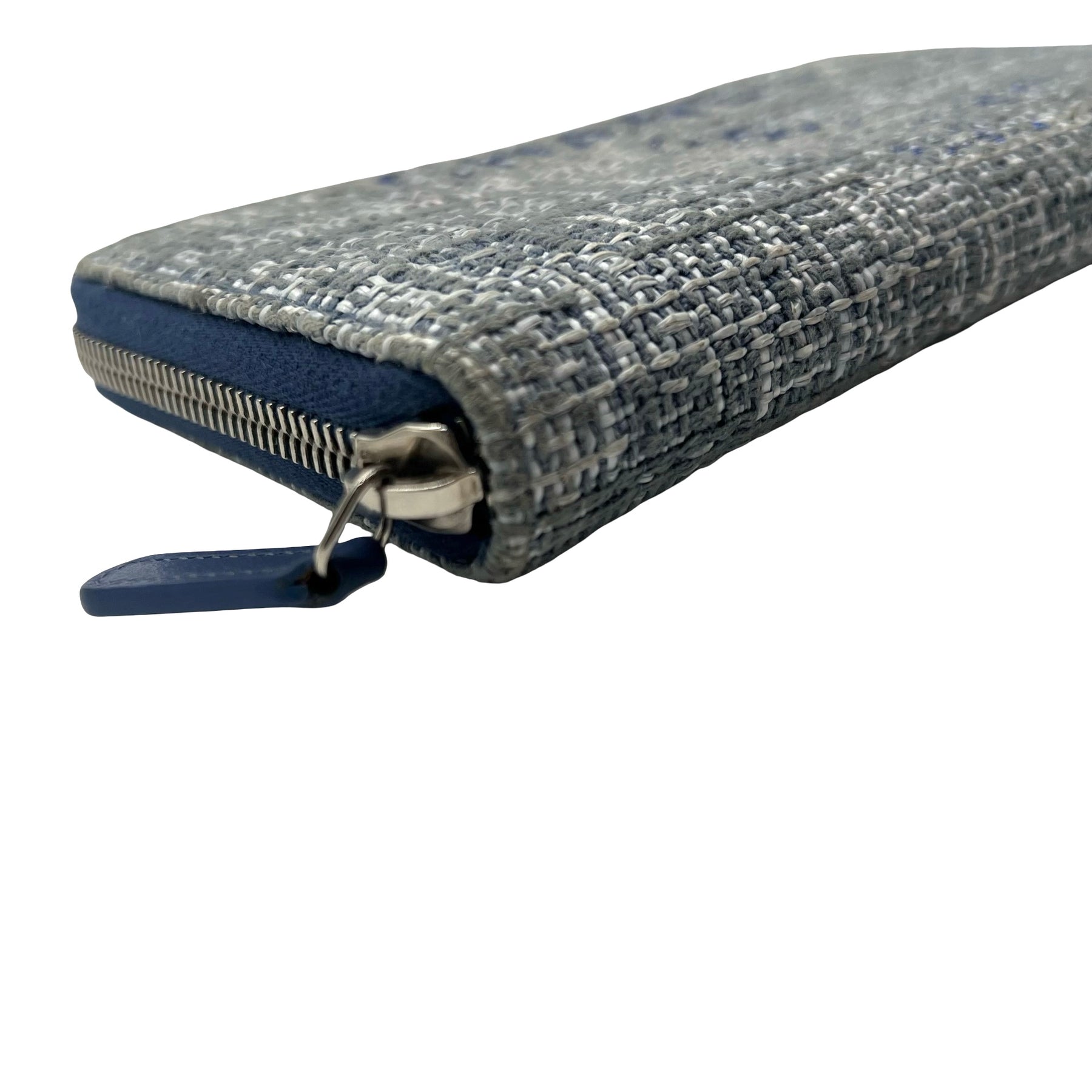 Cartera Chanel, Deauville Zip Continental, de tweed color azul con logo brilloso al frente, cierre y compartimentos al interior. Con desgaste de uso.
