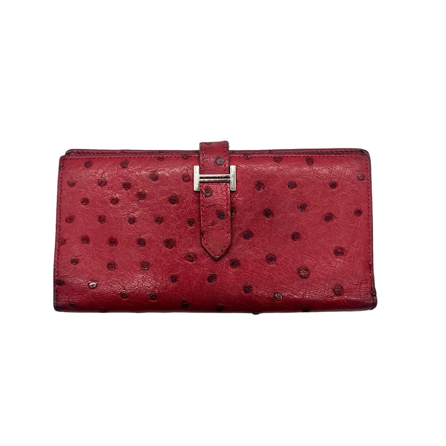 Cartera Hermès Bearn, en piel de avestruz color rojo con broche metálico H y correa. Con varios compartimentos y cierre por dentro. Con desgaste de uso.