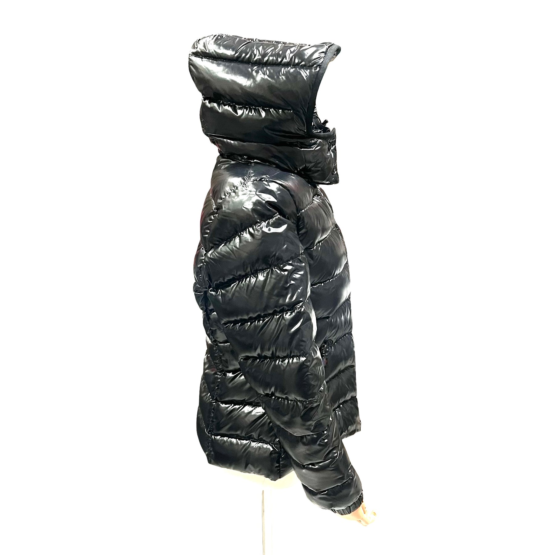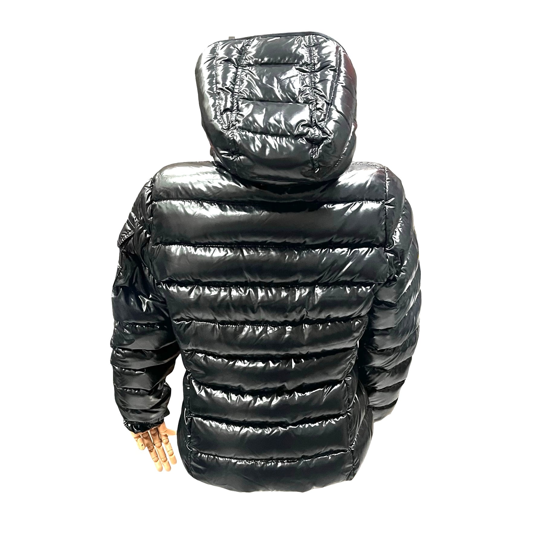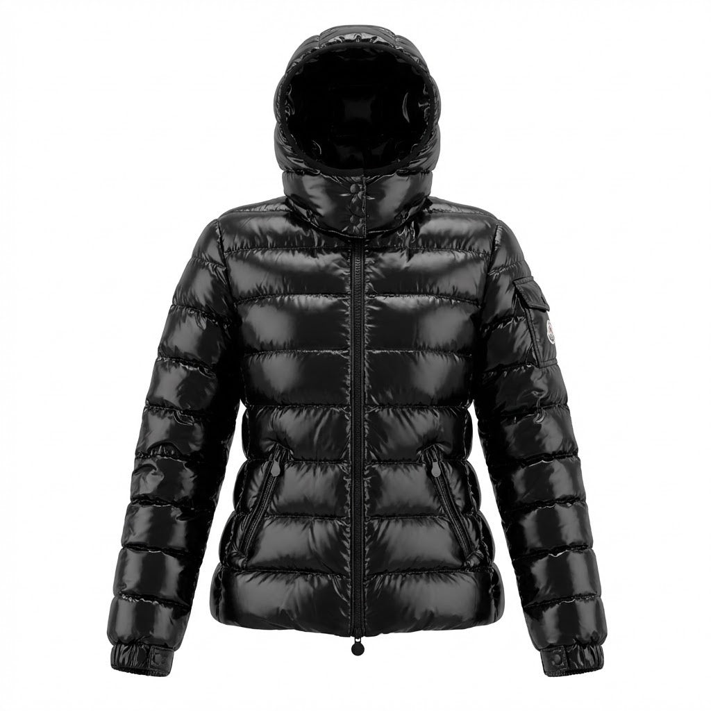 Chamarra Moncler Bady, acolchada, de Nylon color negro brillante con gorro. Con botón faltante en gorro, en buen estado.