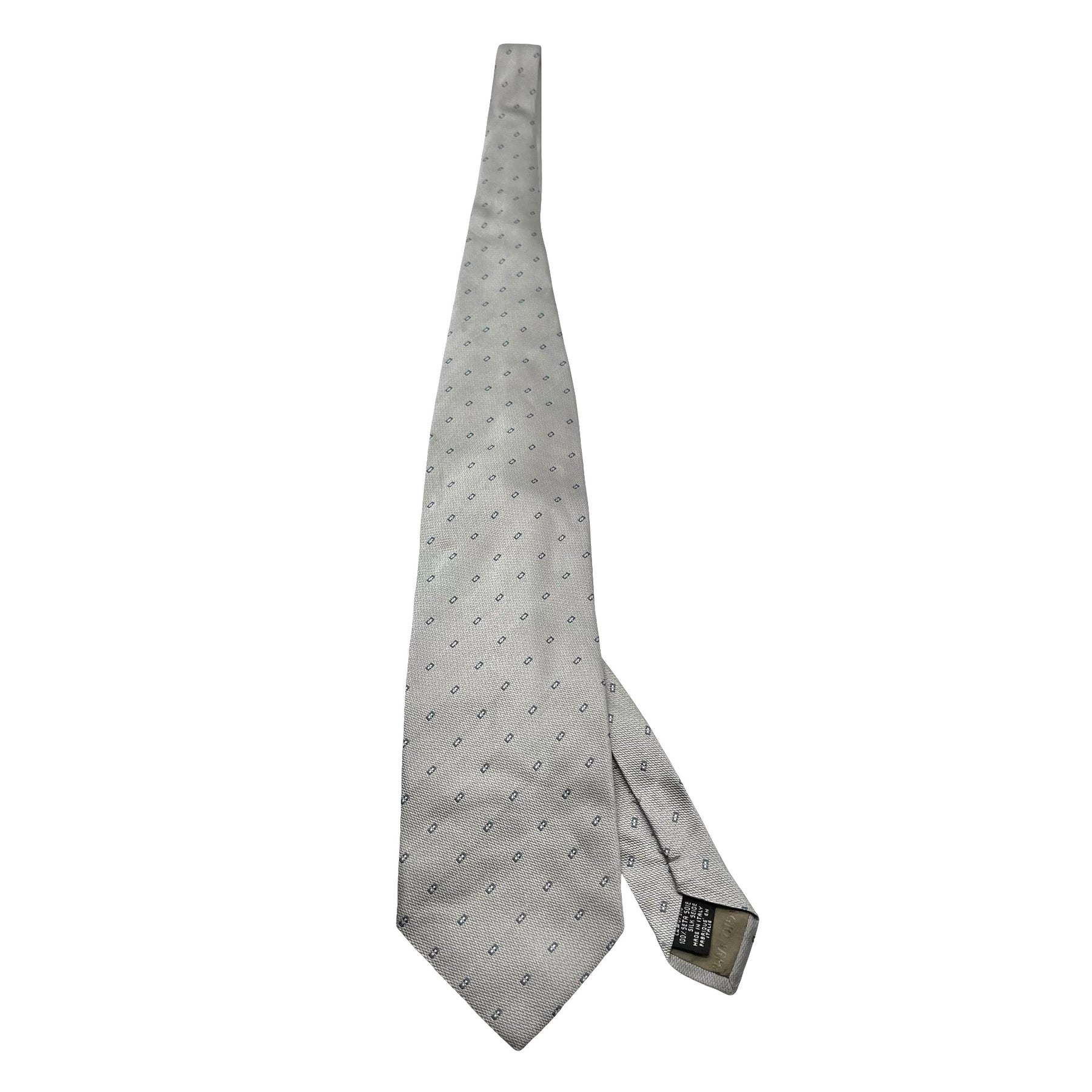 Corbata Armani Collezioni, de seda color plateado con motivo de rectángulos azules. Con uso, en buen estado.
