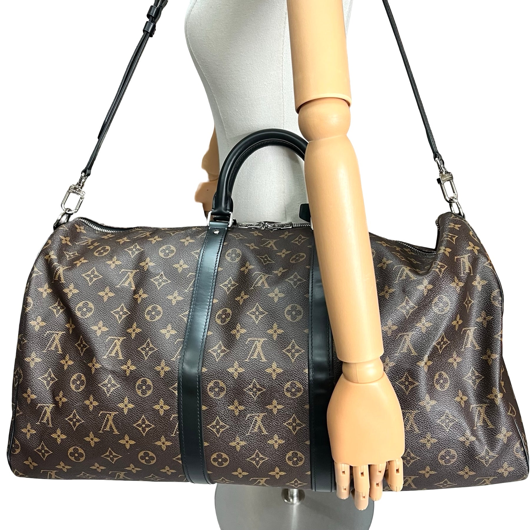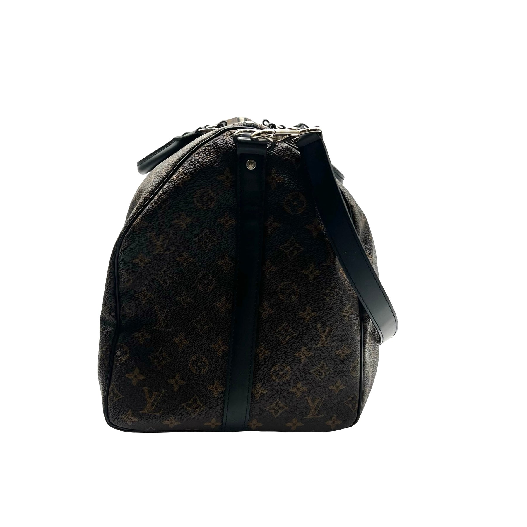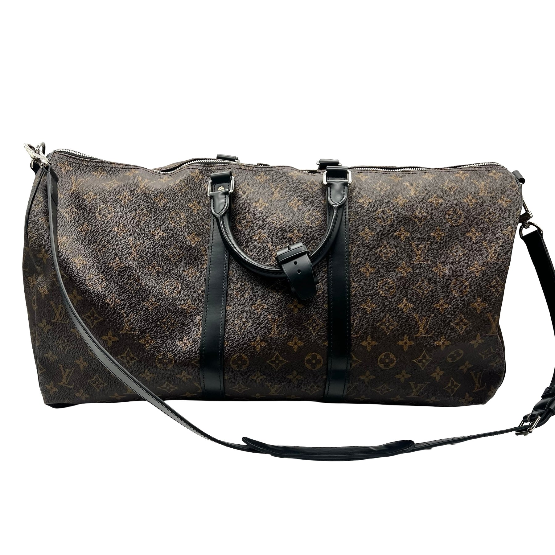 Maleta Louis Vuitton Keepall 55, en Canvas Monogram color café con detalles en negro, dos asas de mano, strap al hombro removible y herrajes en plateado. Con uso, en muy buen estado.