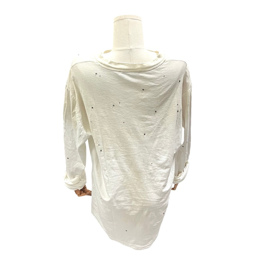 Playera Acne Studios, de algodón color blanco con efecto desgastado, logo en la parte de enfrente, manga larga y aplicaciones de cristales fantasía. Con uso, en buen estado.
