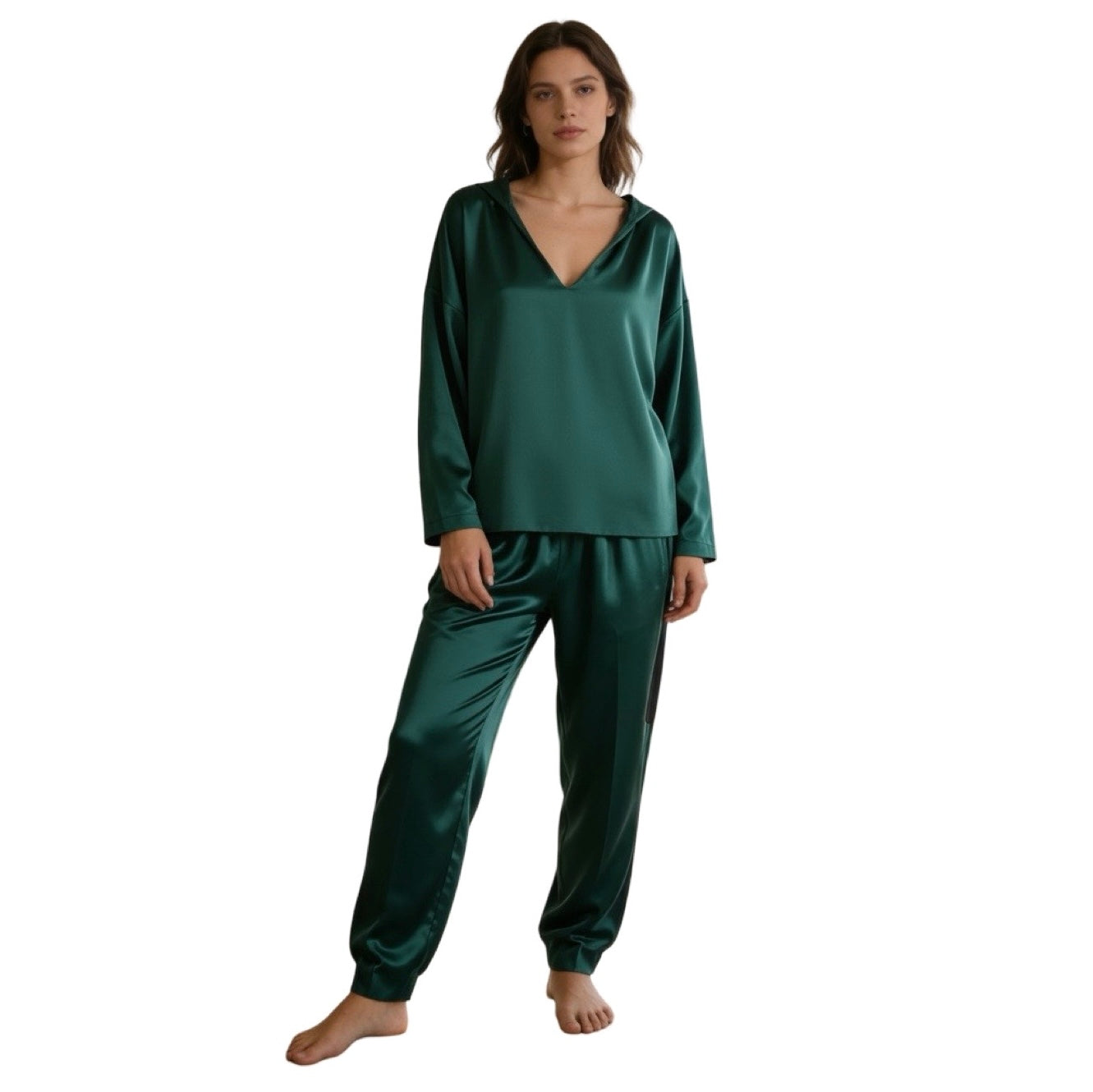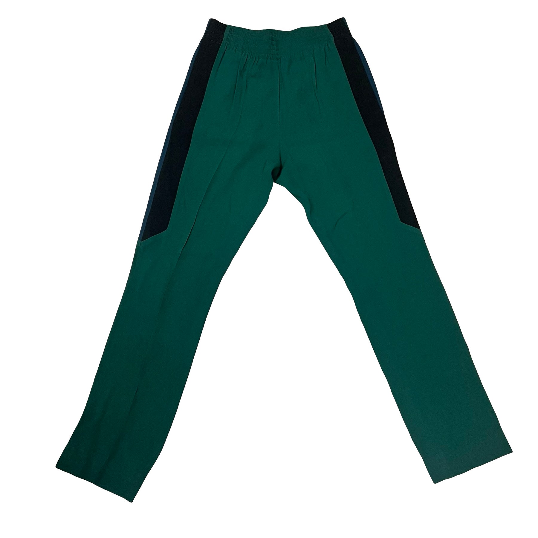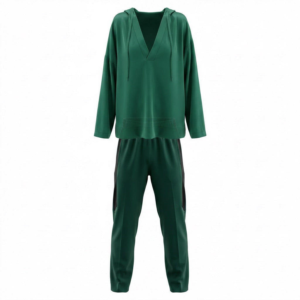 Conjunto Givenchy, pantalón y sudadera, holgados, de algodón color verde con detalles color negro en laterales del pantalón y sudadera con cordones y gorro. Con uso, en buen estado.