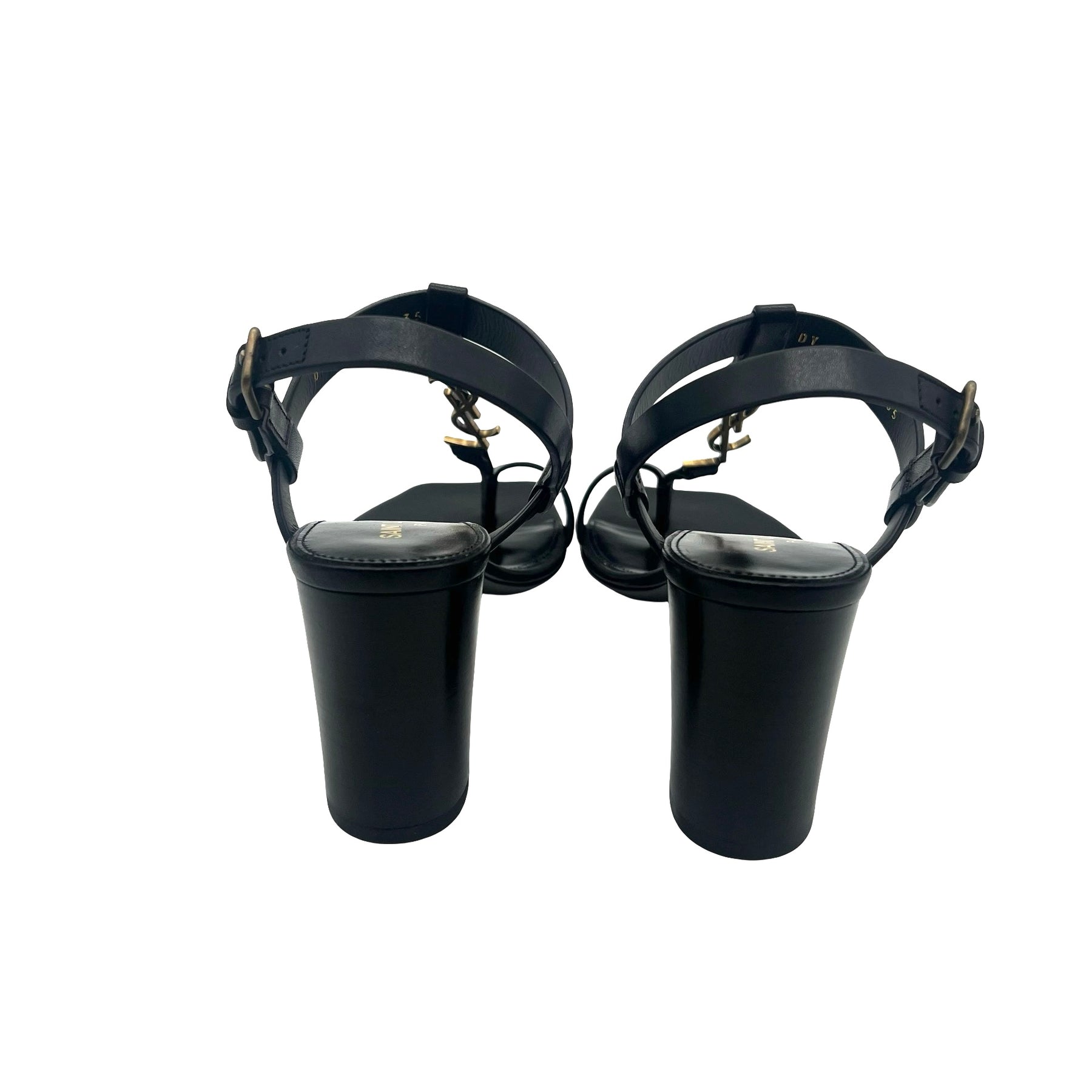 Sandalias Saint Laurent Cassandra, en piel color negro con correa ajustable al tobillo y placa de logo color dorado al frente. Nuevas.