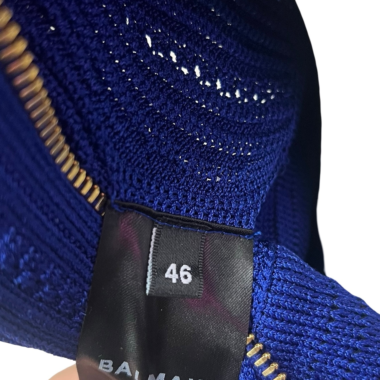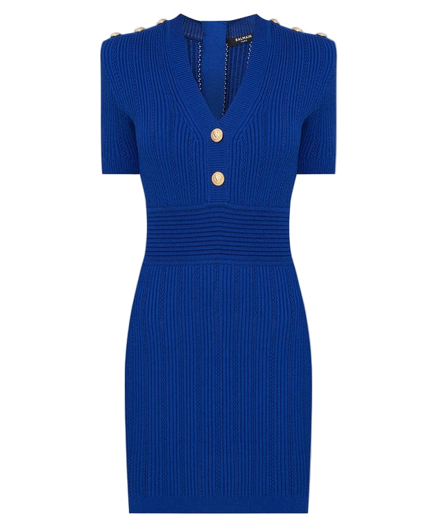 Vestido Balmain, tejido color azul rey con botones dorados, hombreras y cierre en la espalda. Con uso, en buen estado.