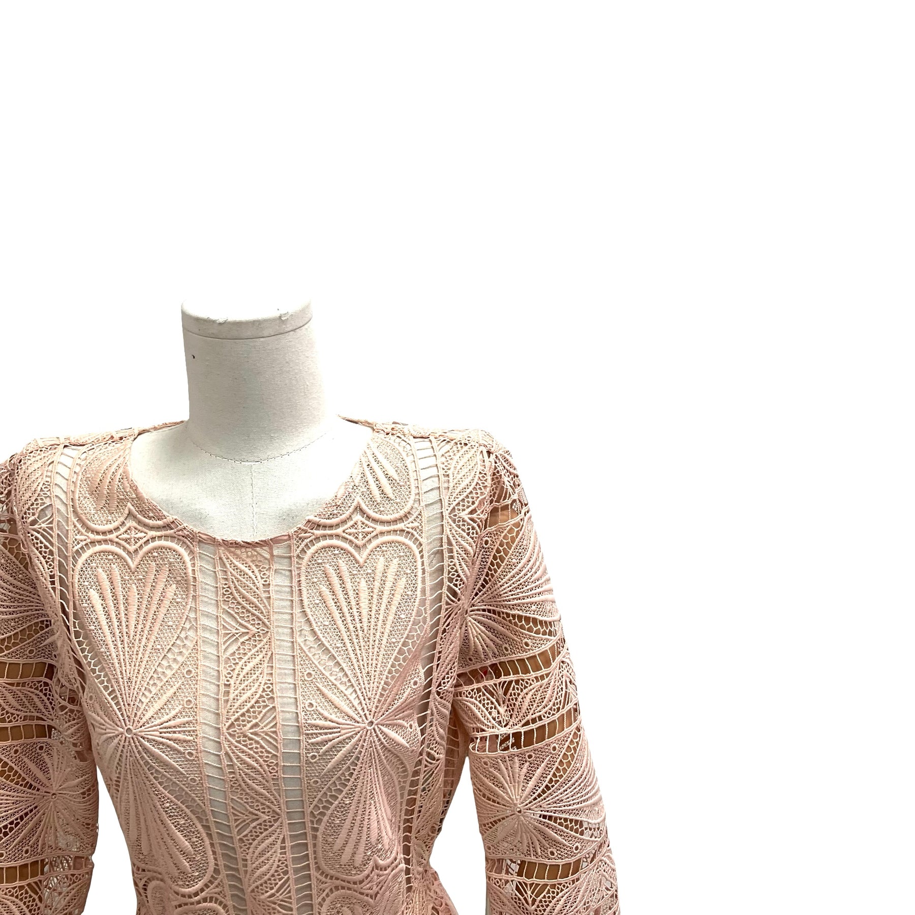 Vestido Maje corto, con transparencias color rosa palo, fondo de tirantes, medio cierre a un costado y apertura en la parte trasera. Con uso, en muy buen estado.