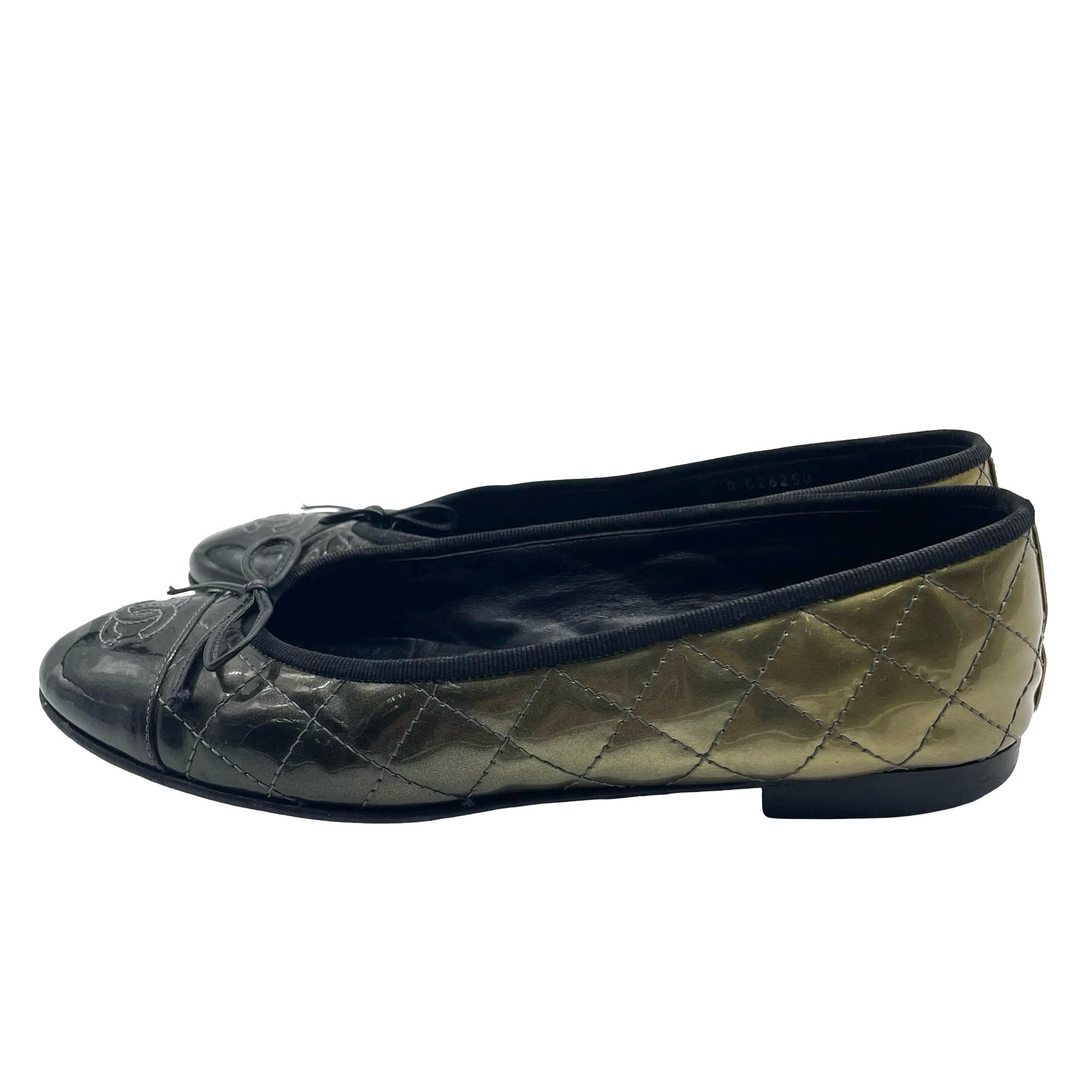 Flats Chanel, de piel acolchonada en terminado de charol color negro y dorado degradado. Con uso en buen estado