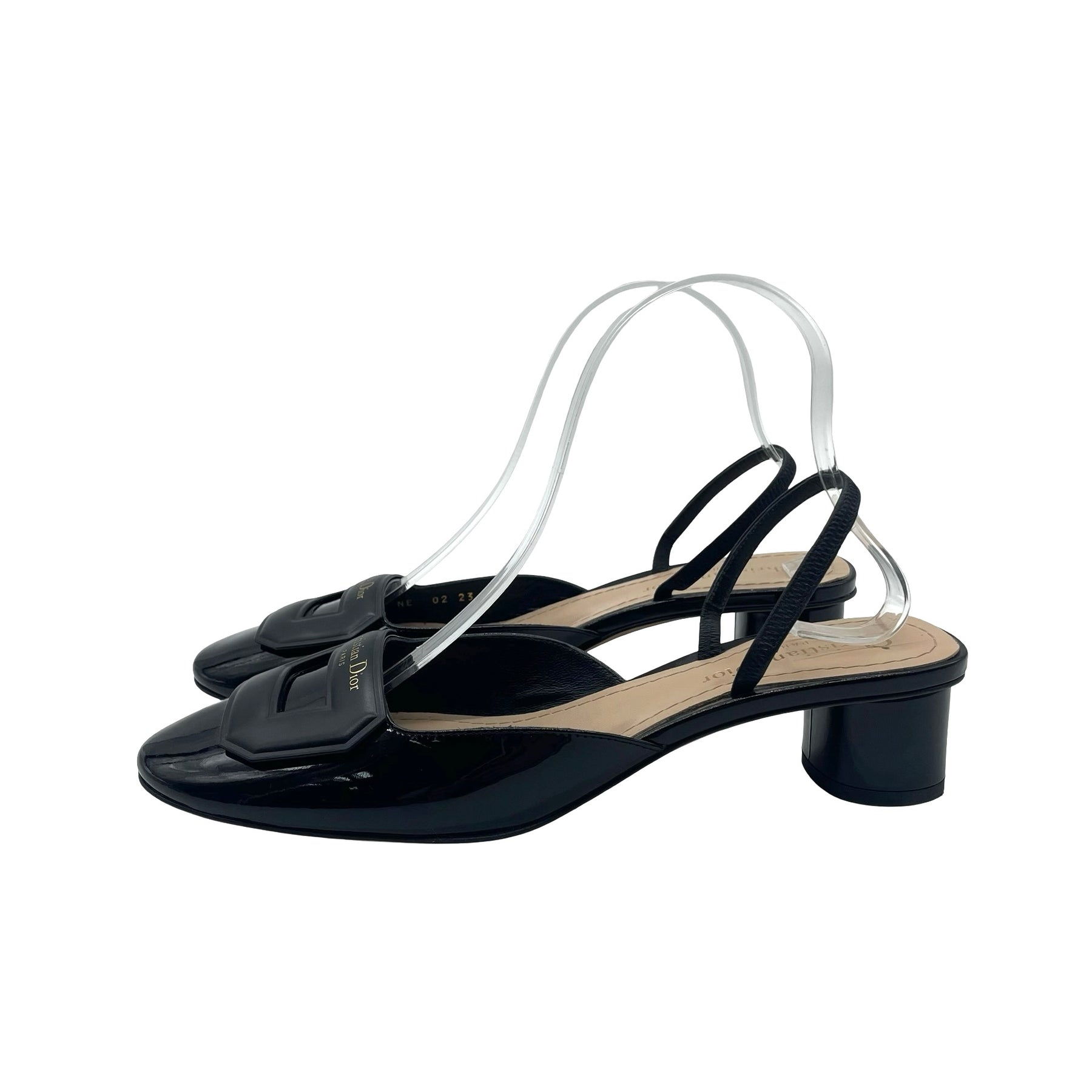 Pumps Dior Sling Back, de piel color negro con terminación en charol, hebilla y logotipo en color dorado en punta. Con eso, en buen estado.