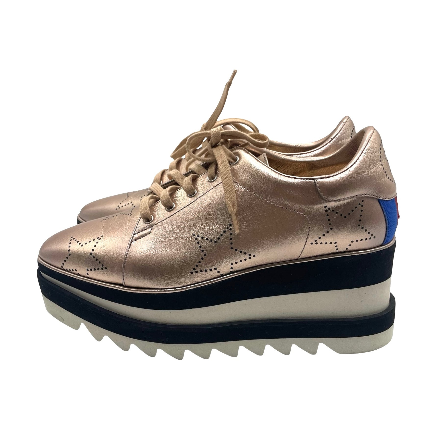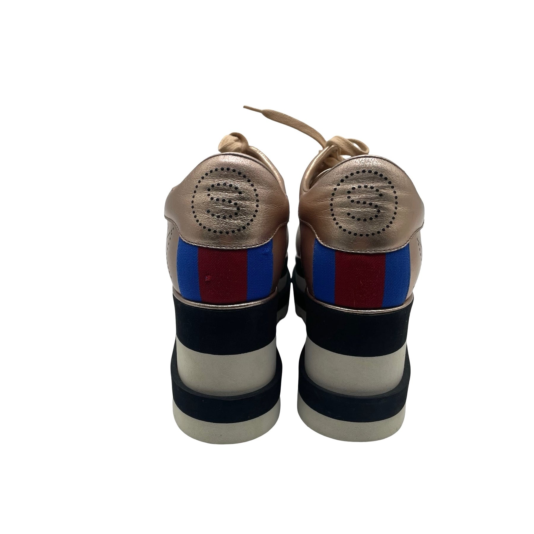 Zapatos Stella McCartney de piel vegana, con estrellas en color rose gold en color blanco con rayas rojas y azules. Con uso, en buen estado.