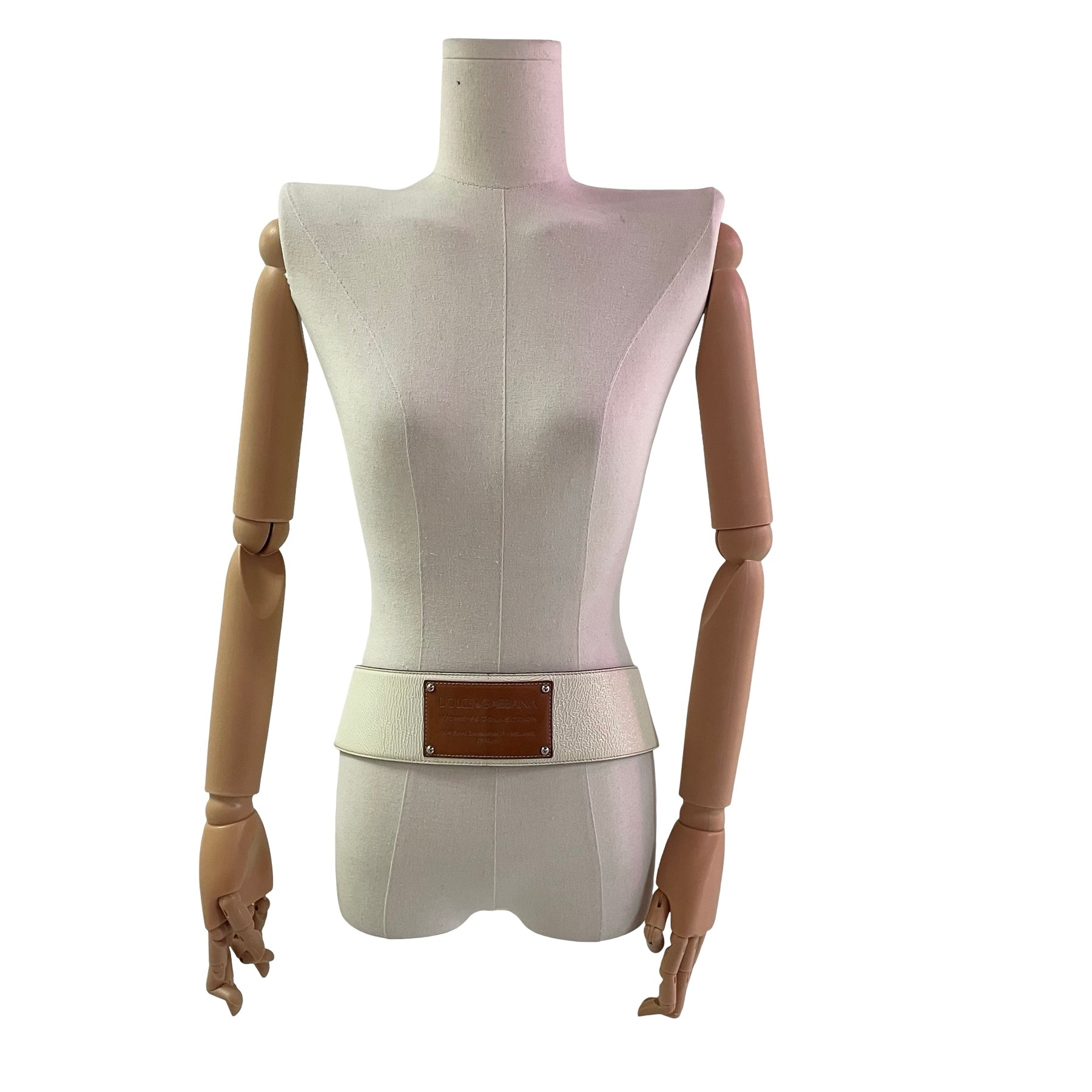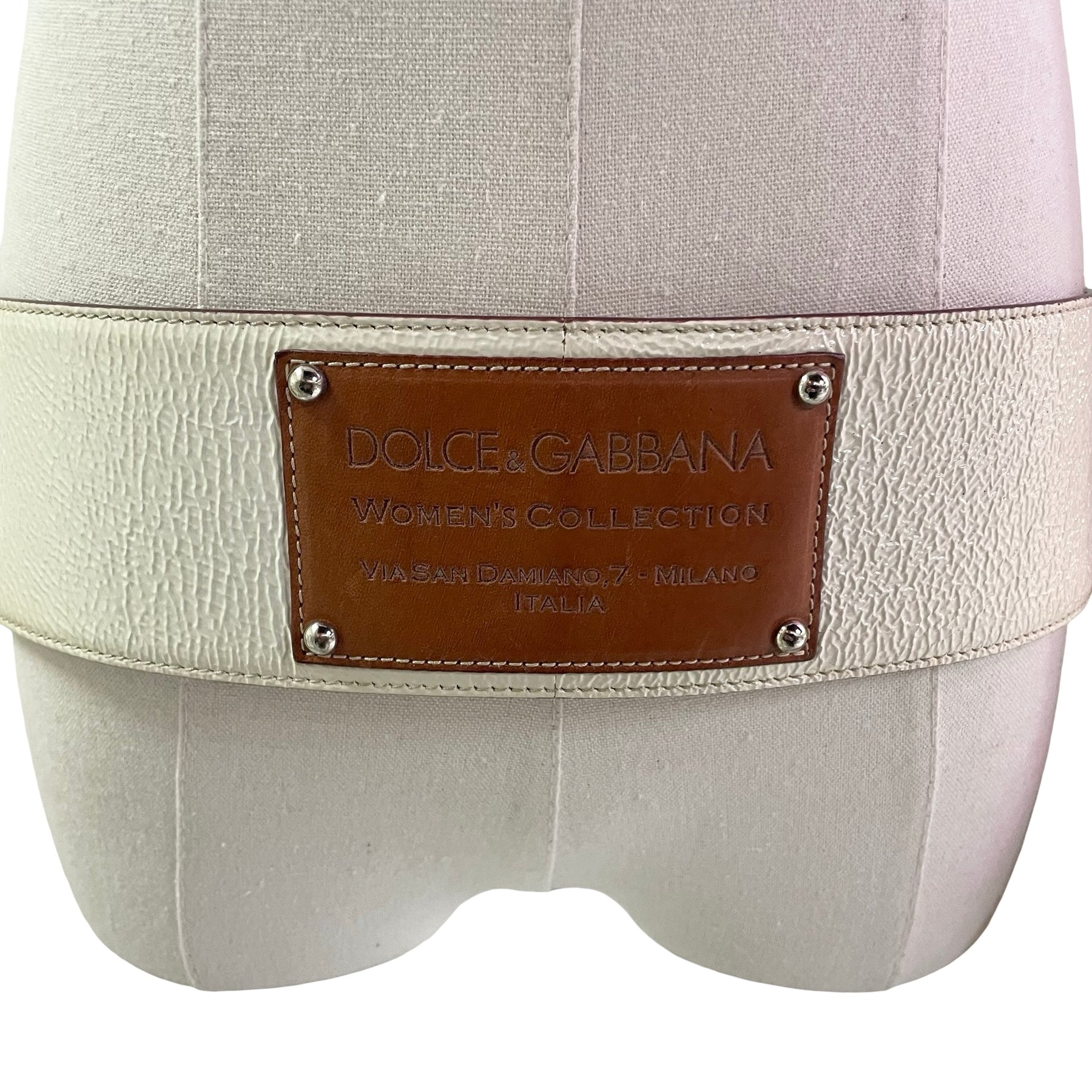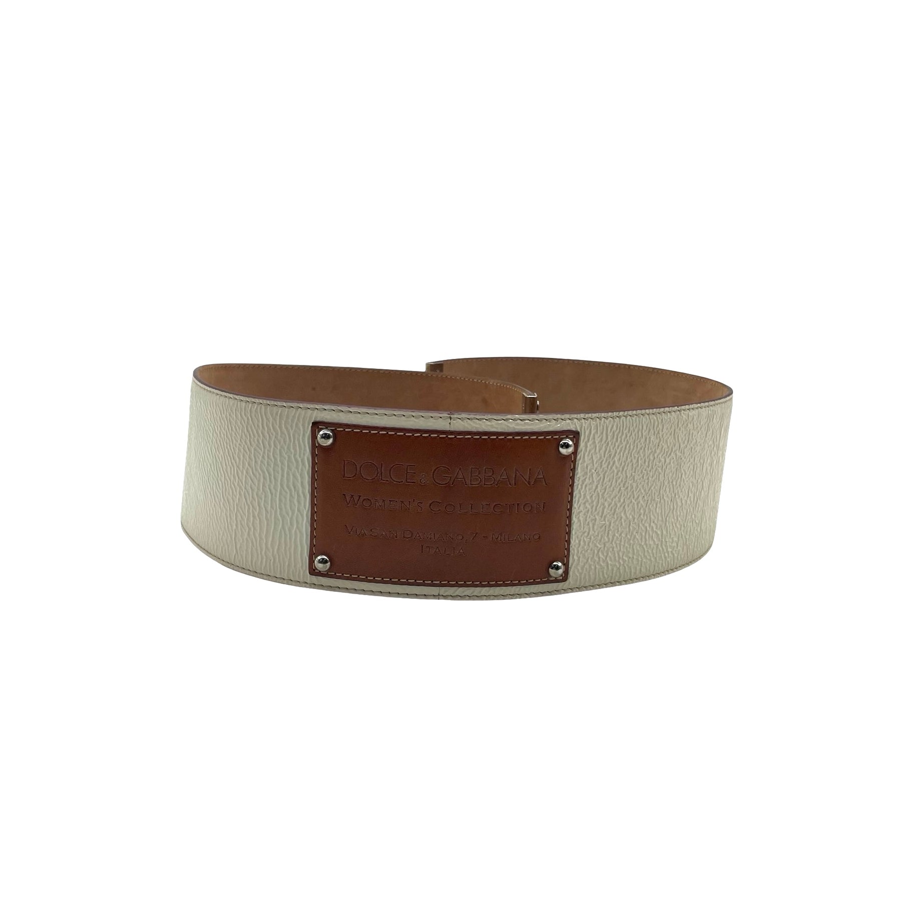 Cinturón Dolce & Gabbana, de piel color en terminado de charol color blanco con parche de piel enfrente y herrajes en plateado. Con uso en buen estado