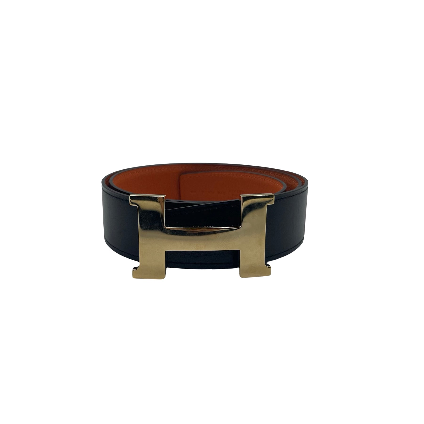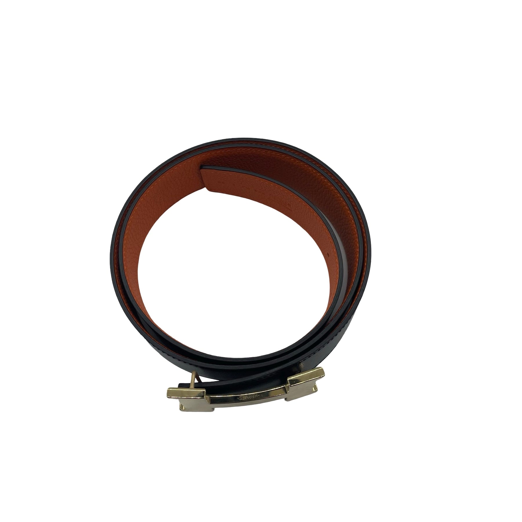 Cinturón Hermès Reversible, de piel color negro y naranja con hebilla dorada. Con uso en buen estado