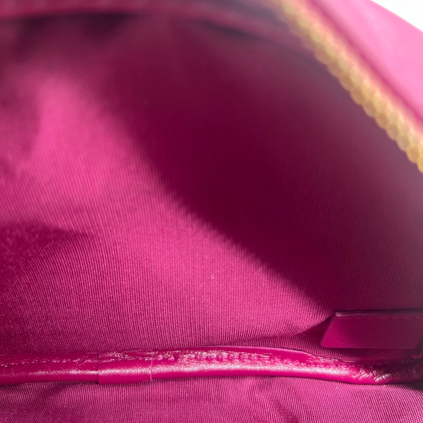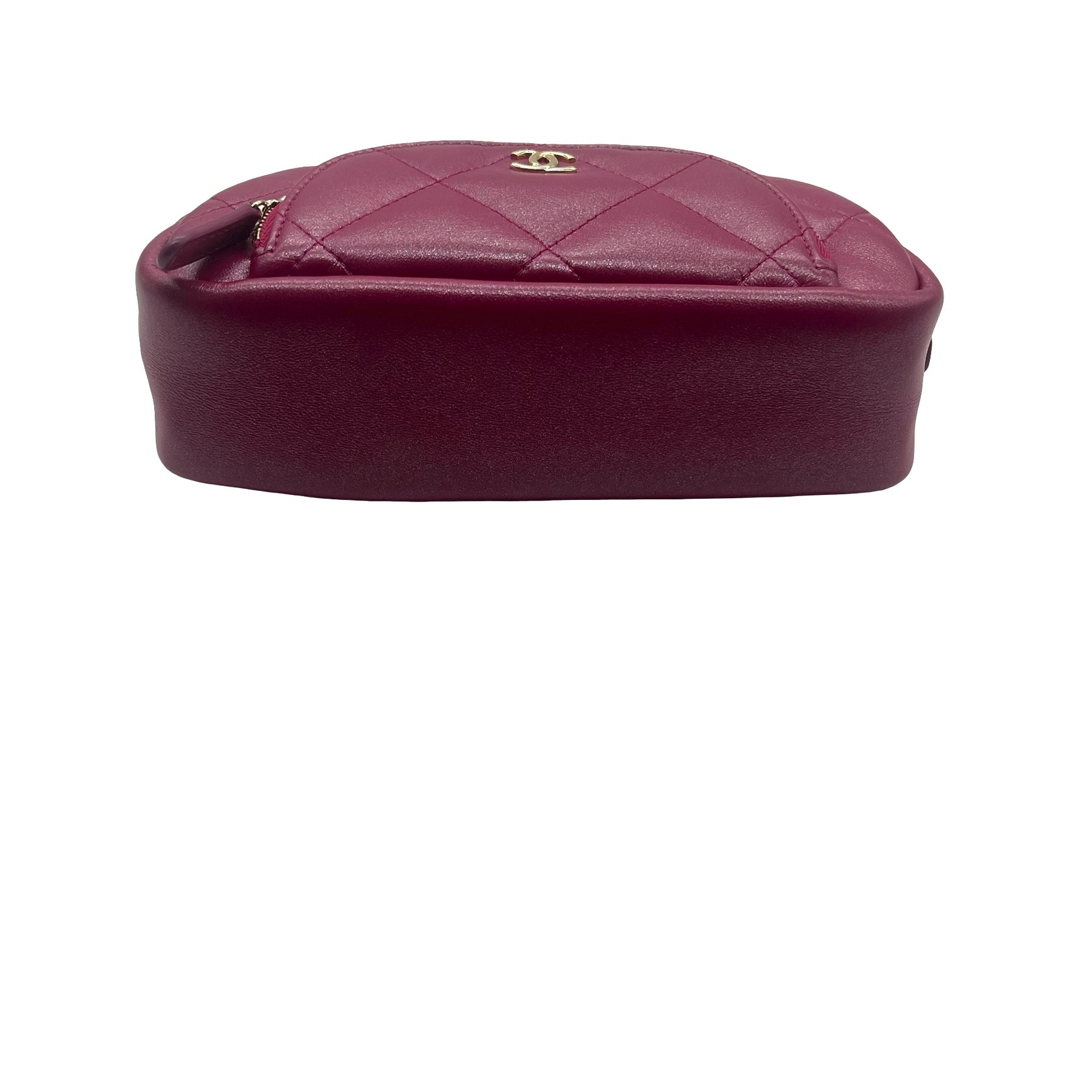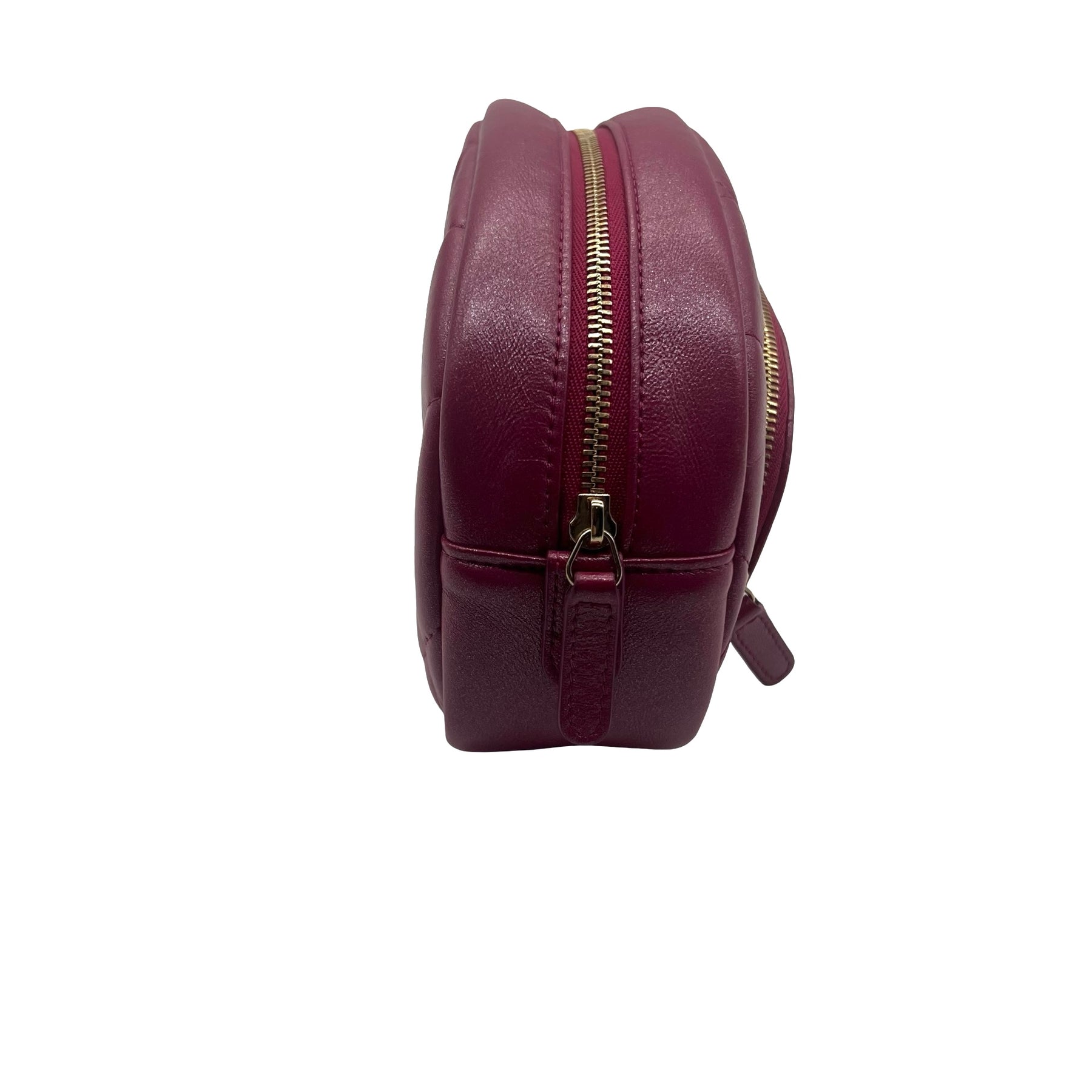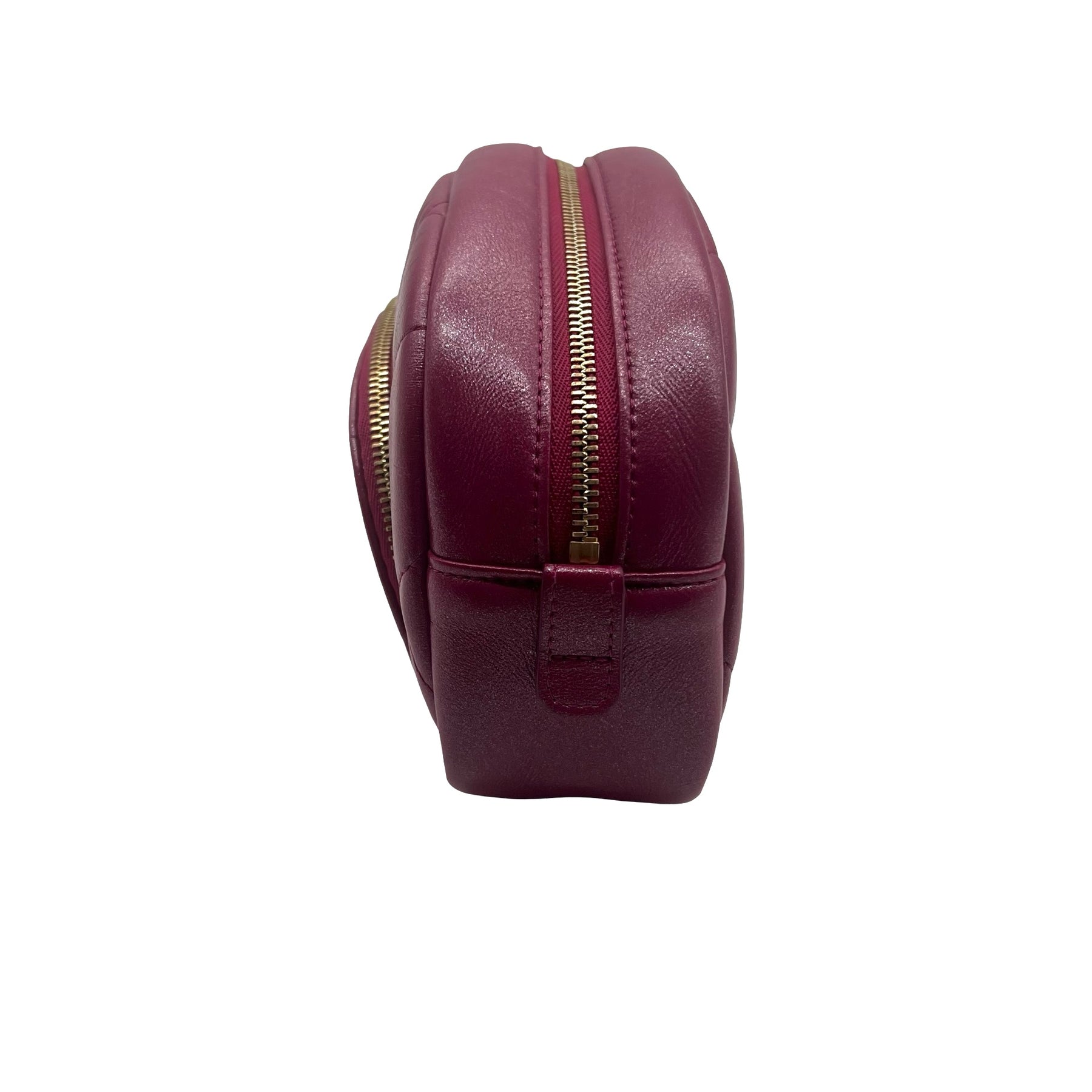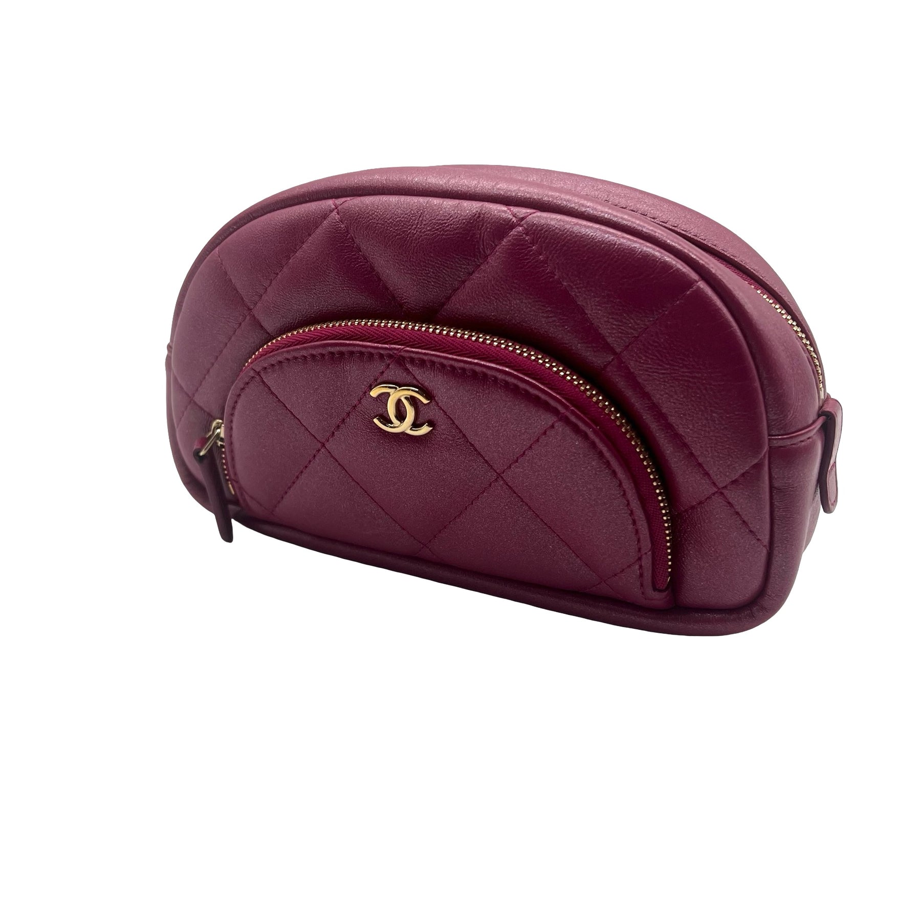 Cosmetiquera Chanel, de piel color borgoña ligeramente metalizada, logo CC al frente y cierre color dorado. En buen estado.