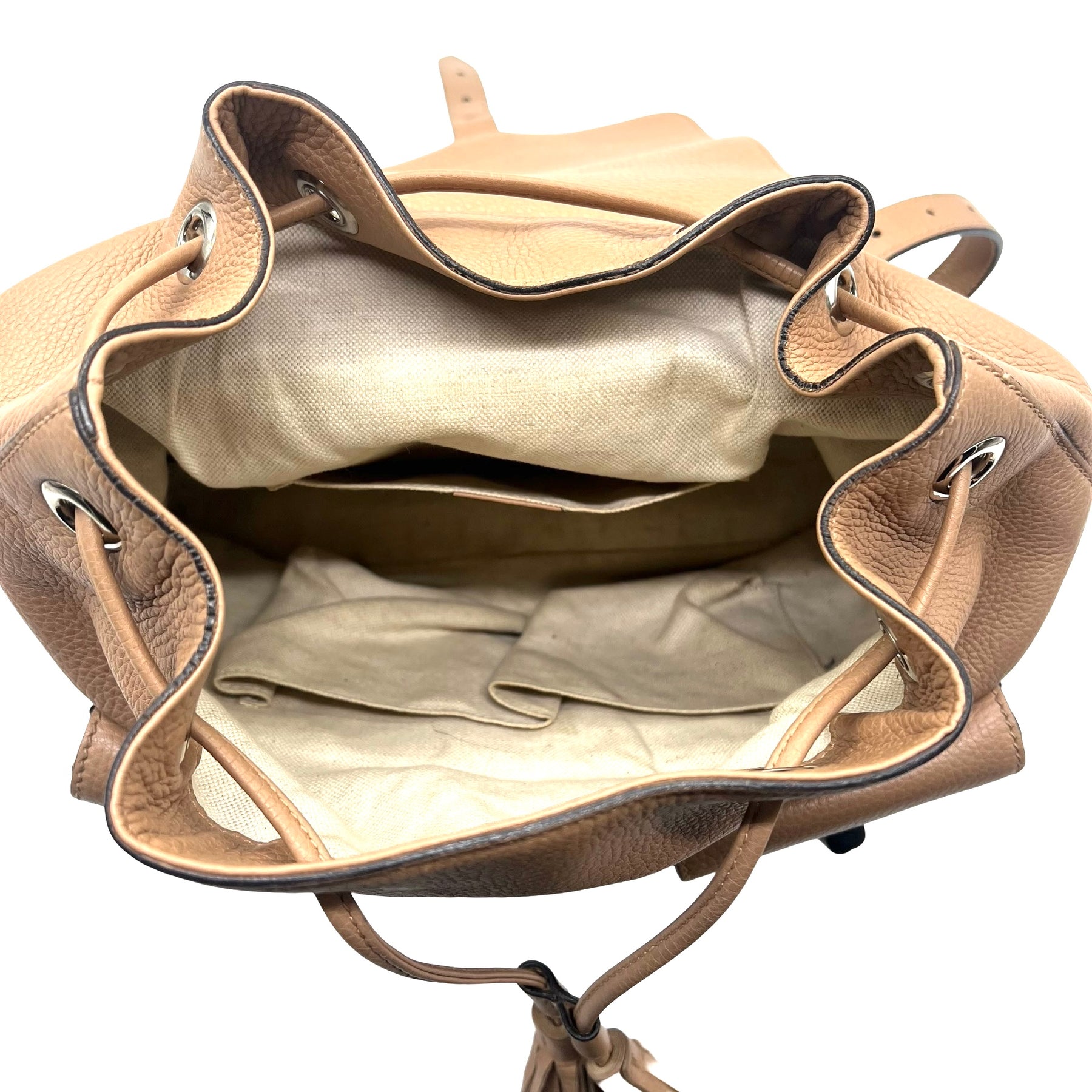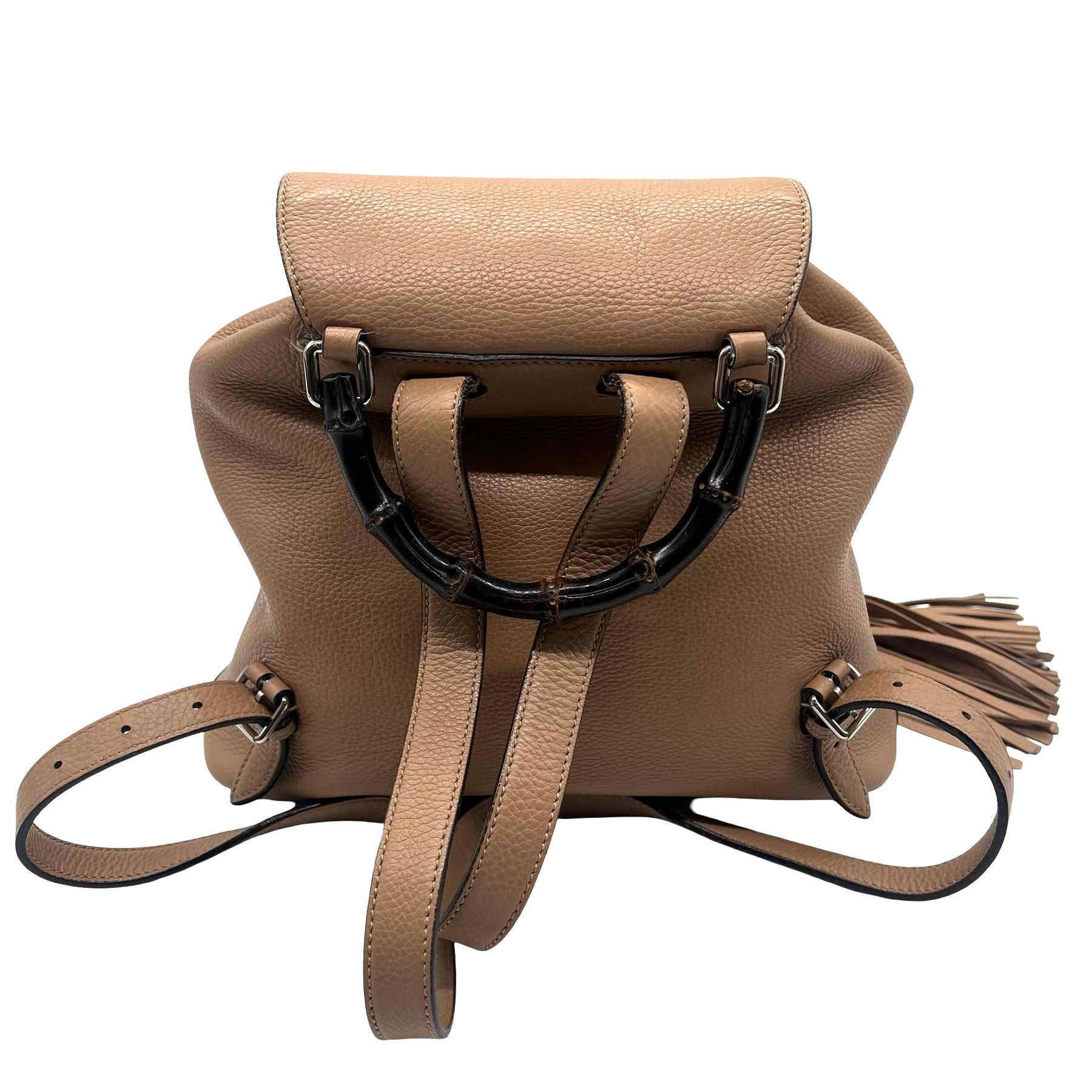 Mochila Gucci Bamboo en piel granulada color beige. Dos bolsas en el exterior con detalles y asa de bamboo. Con uso, en buen estado.