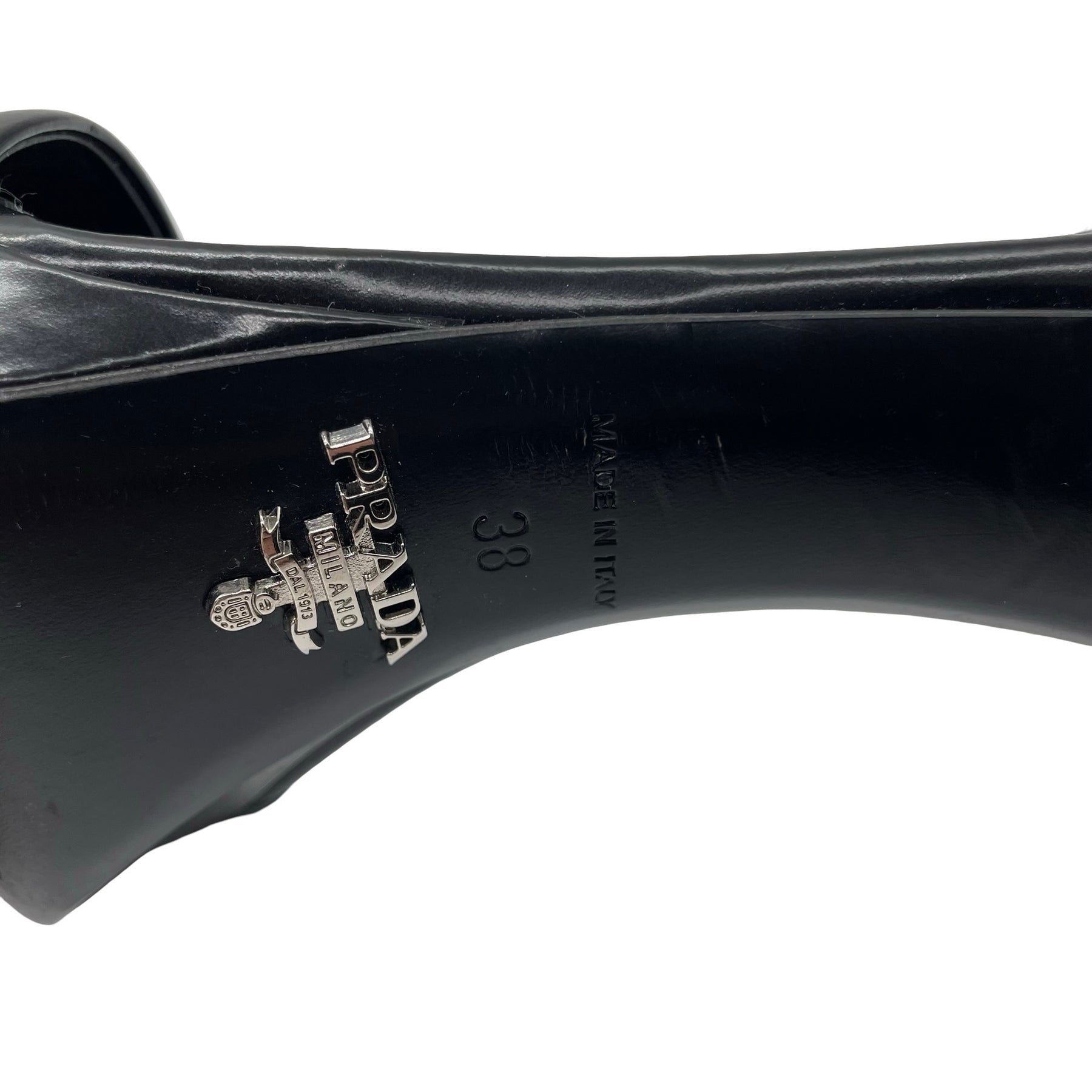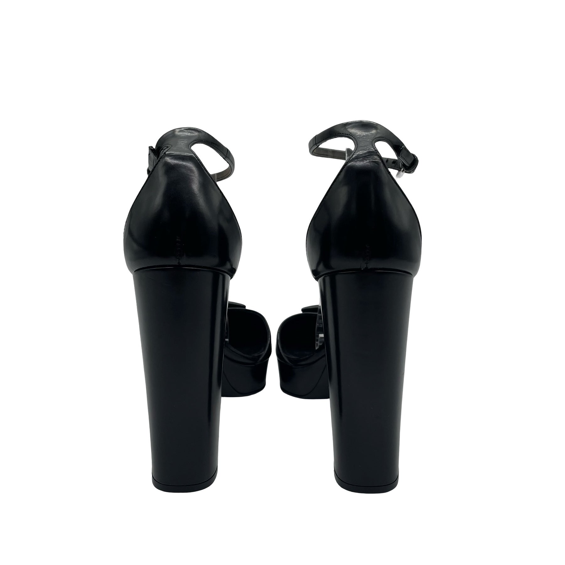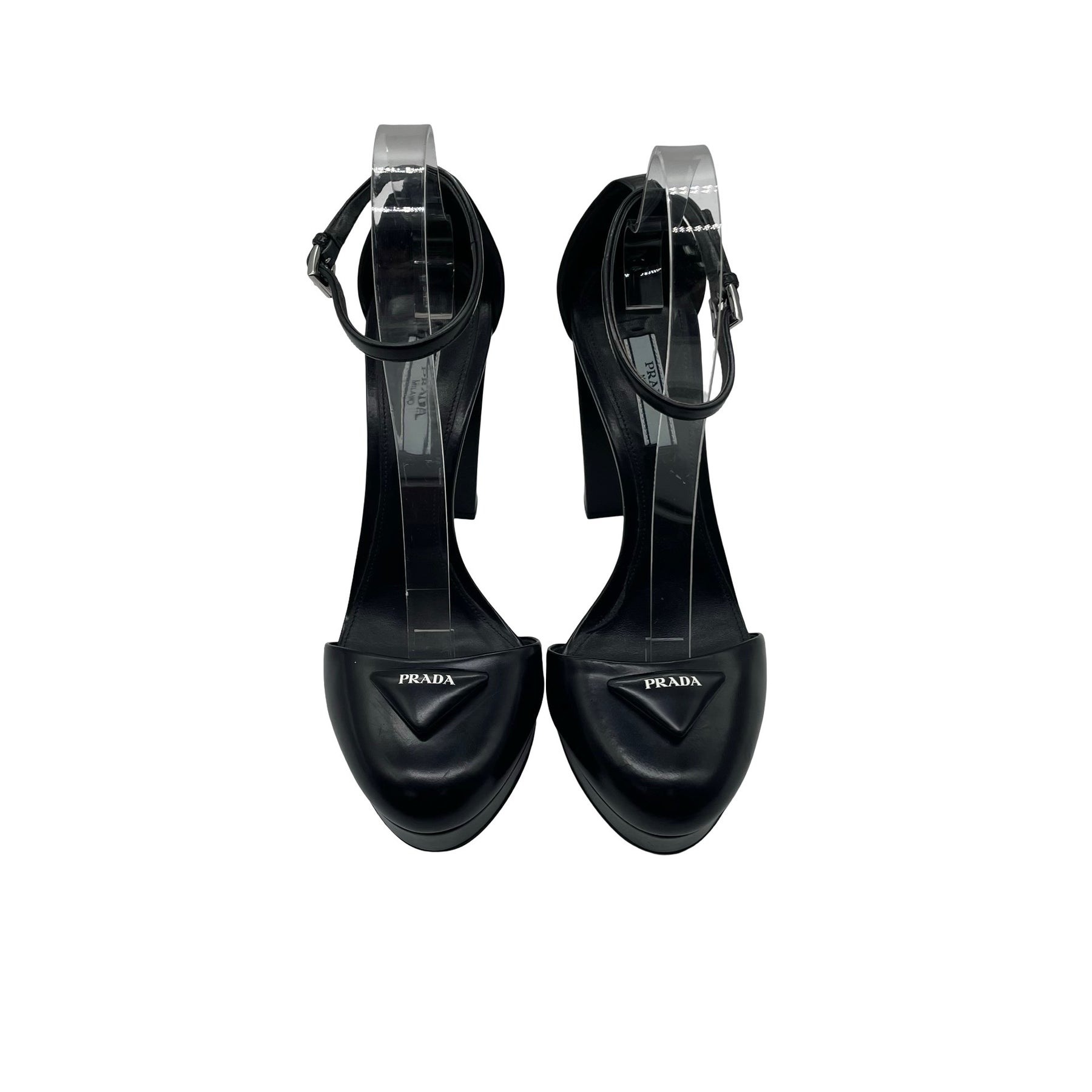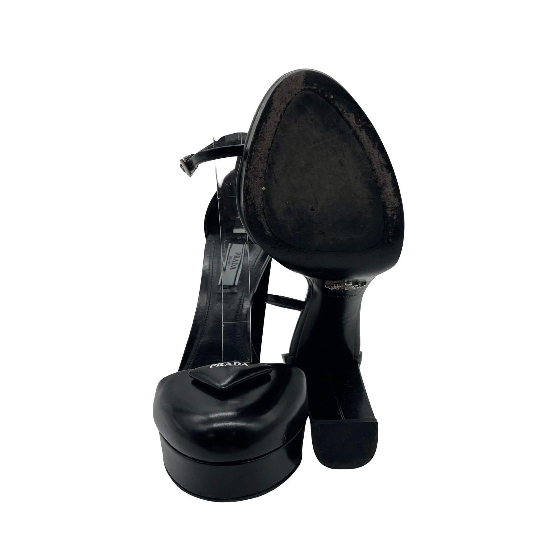Pumps Prada de piel color negro, placa enfrente y correa para tobillos con herrajes en plateado. Con uso, en buen estado.